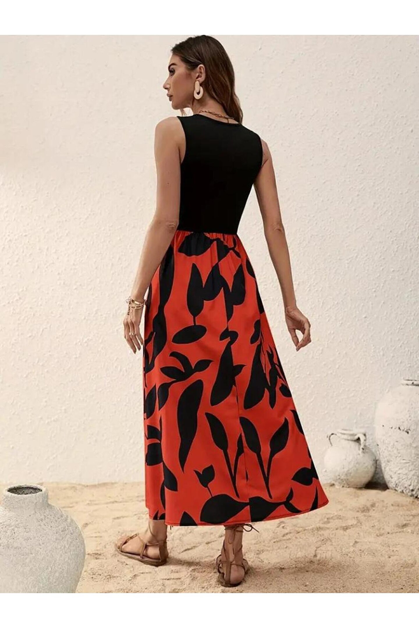 MissRunin Kadın Askılı Yuvarlak Yaka üst Viskon Alt Desenli Uzun Süprem Elbise