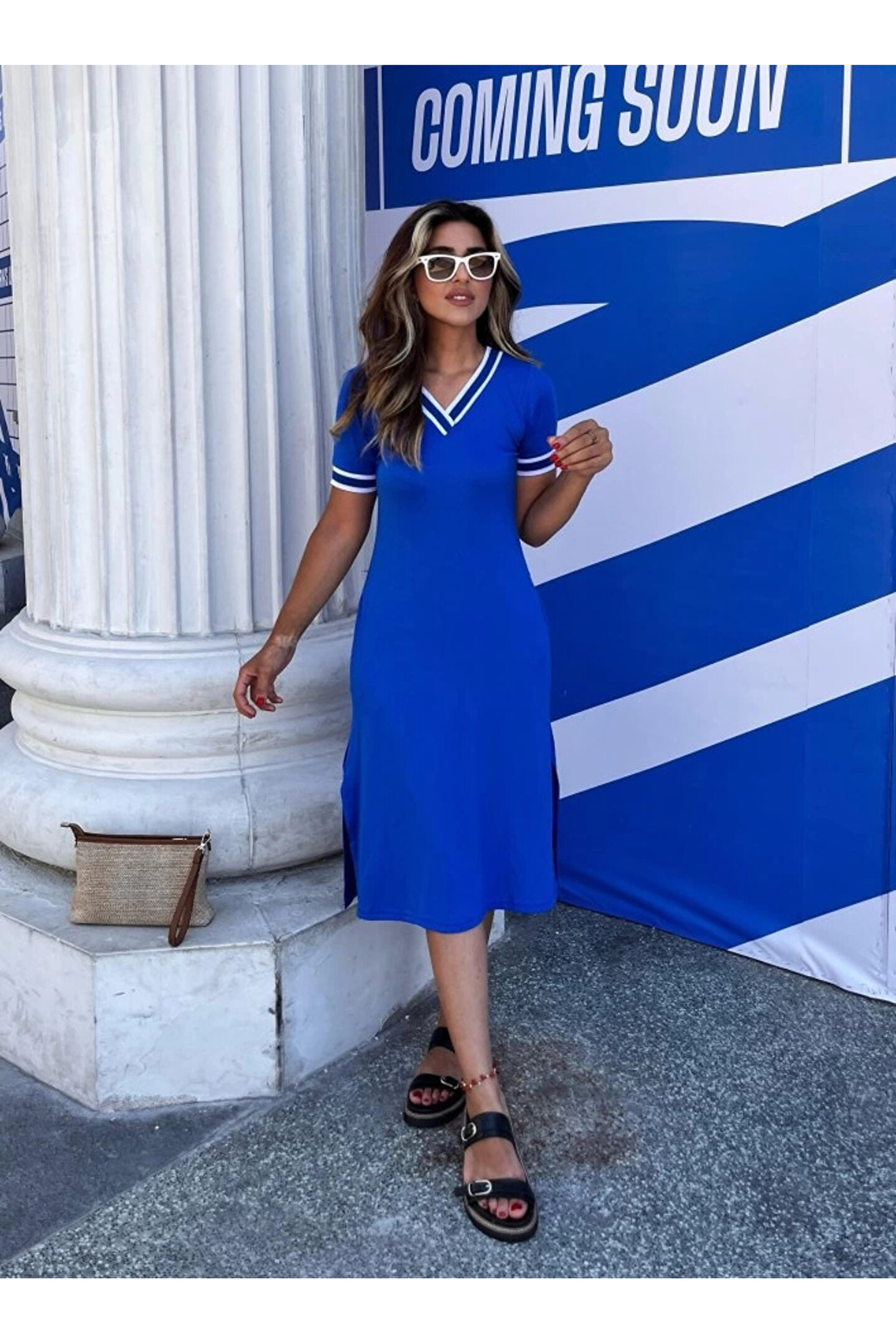 MissRunin Kadın Kısa Kollu V Yaka Ve Yaka Ribana Detay Midiboy Viskon Elbise