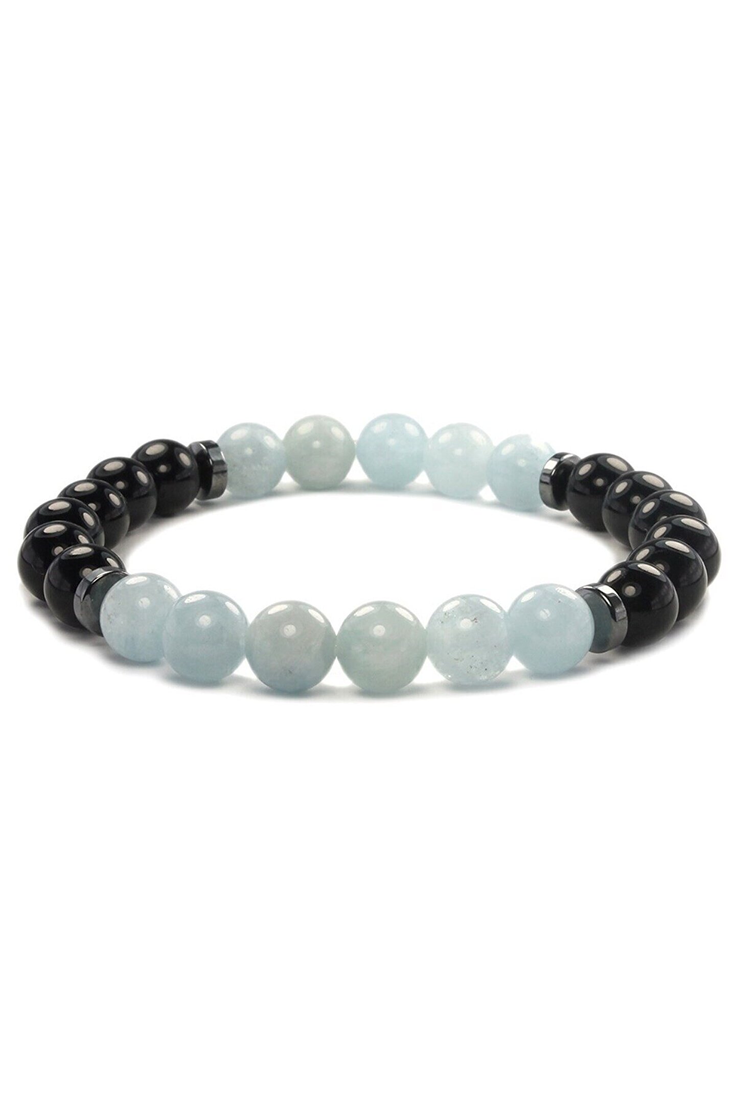Bu zarif bileklik, doğanın güzelliğini parmaklarınıza taşıyan bir mücevherdir; Aquamarin ve obsidyen taşların eşsiz uyumu ile tasarlanmıştır ve her tür kıyafetle kolayca uyum sağlar; 8 mm kalınlığındaki doğal taş boncukları, hem rahatlık hem de estetik bir görünüm sunar; Bu bileklik, günlük kullanım için idealdir ve her zaman şık görünmenizi sağlar; ;;