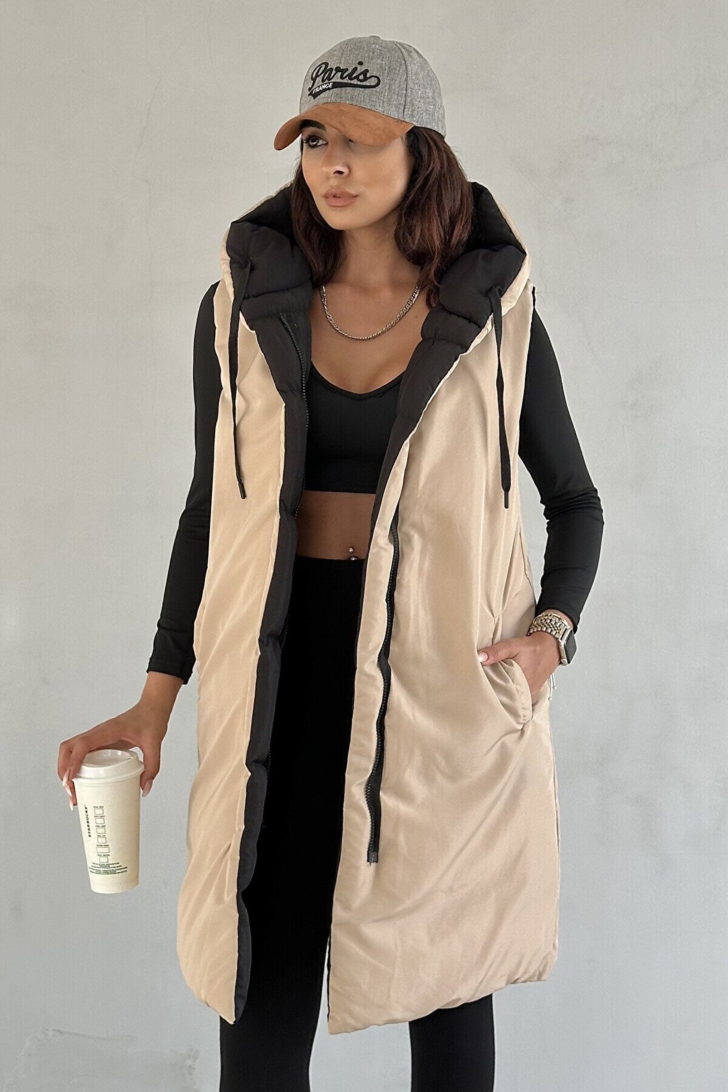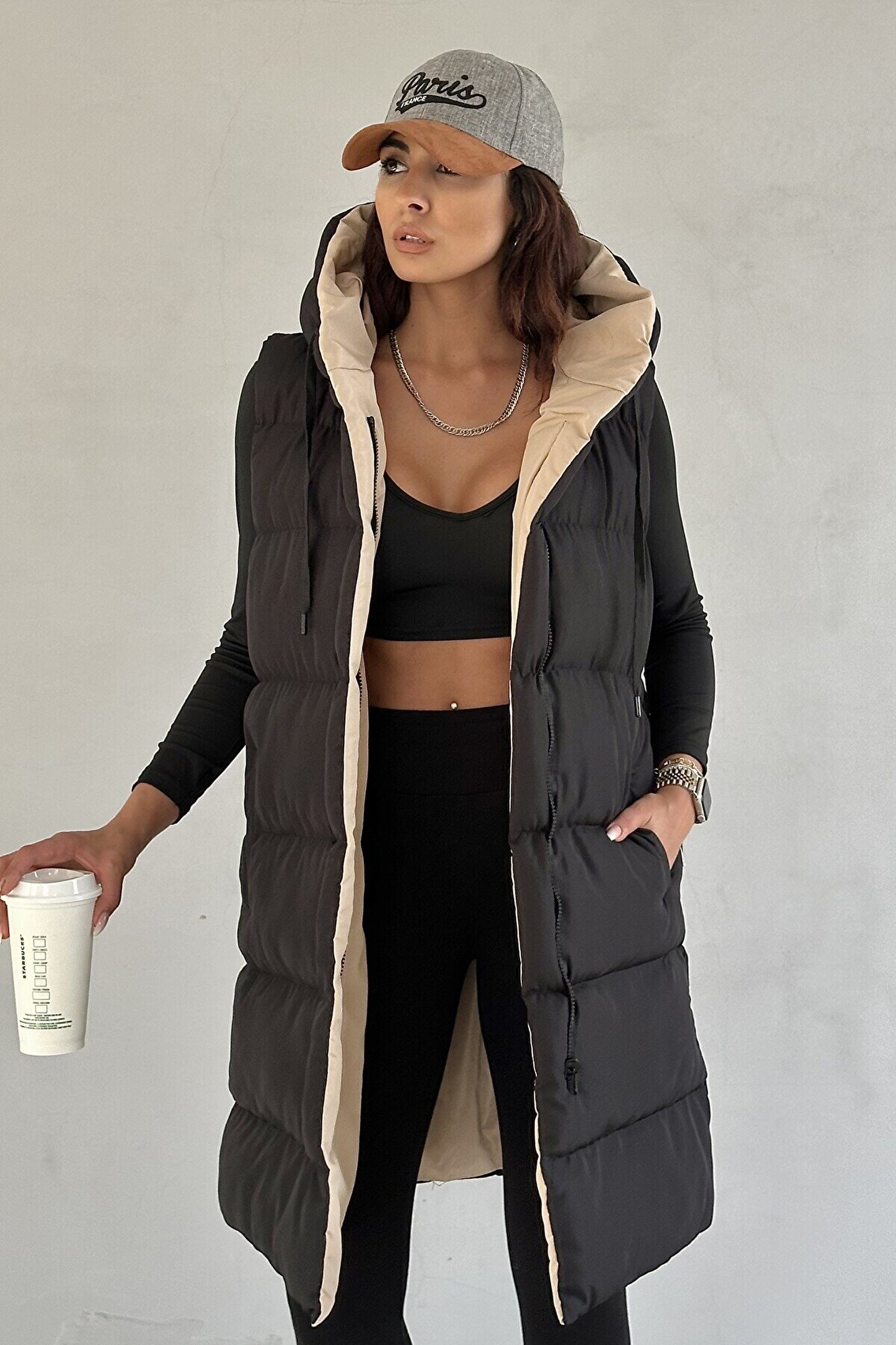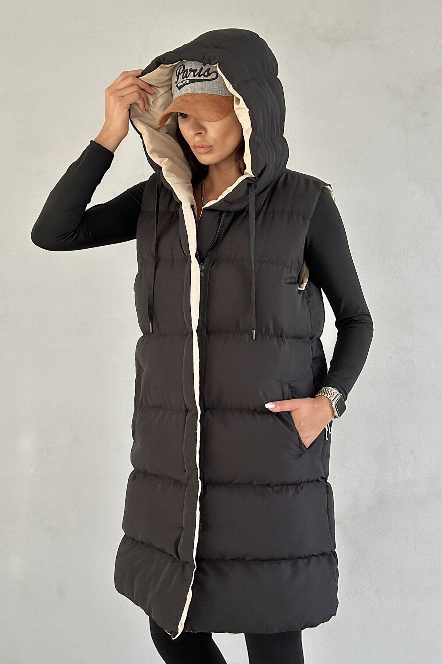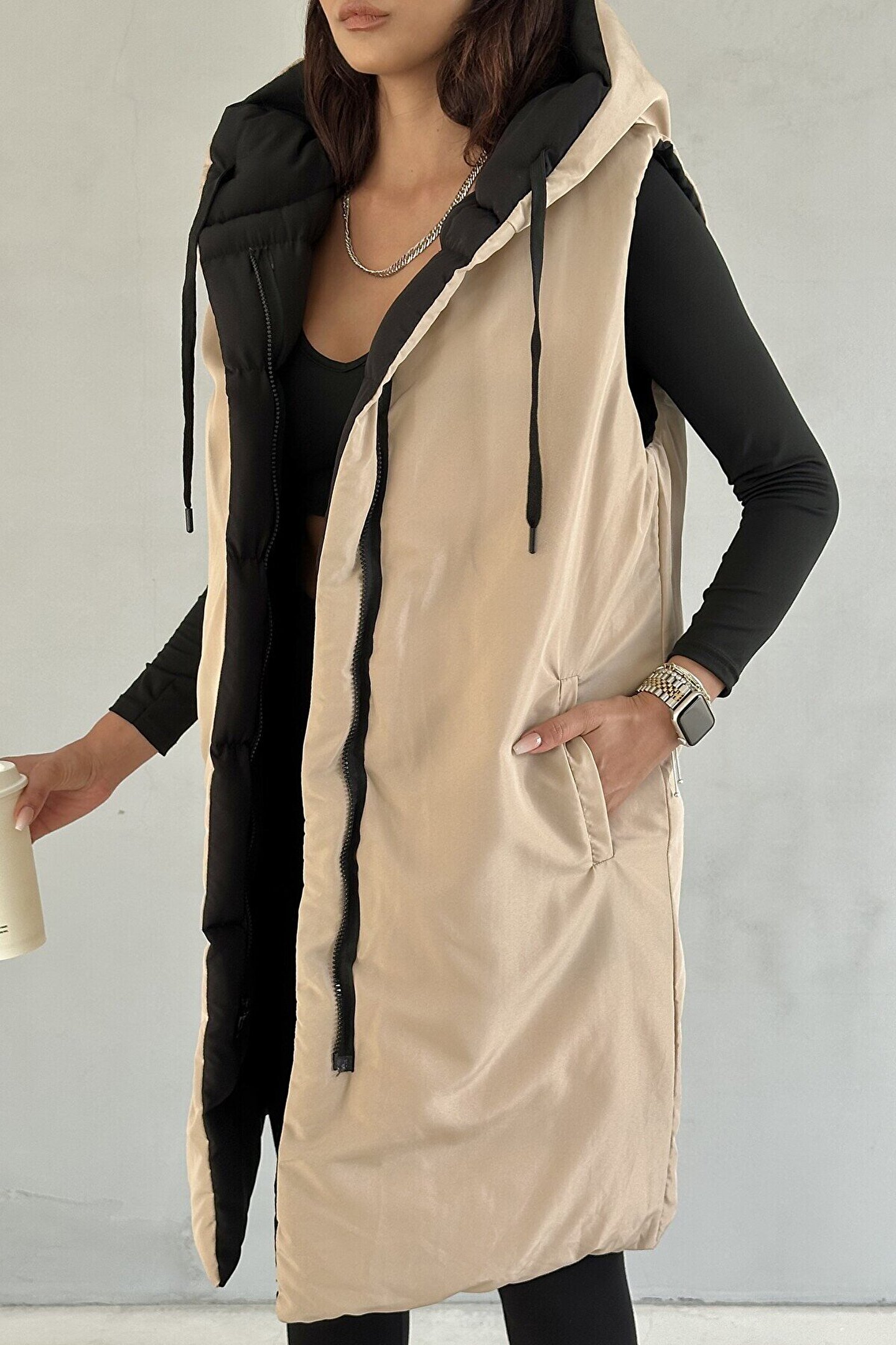 moda armanc Kadın Çift Taraflı Uzun Şişme Yelek Kapüşonlu Oversize - Siyah, Bej