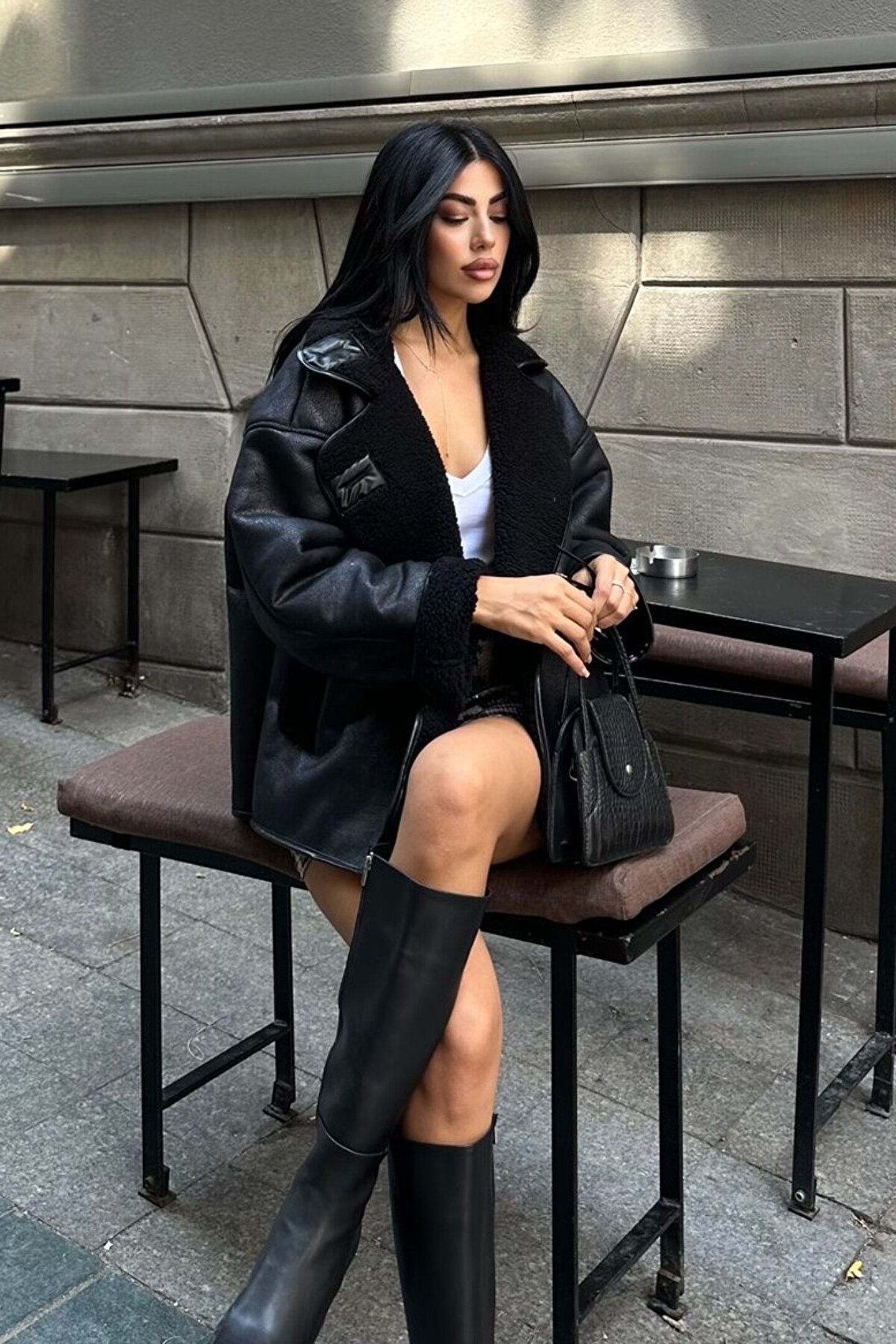 • Şıklığı ve konforu bir araya getiren bu kadın oversize süet deri mont, iç kısmındaki yumuşak kürk astarı ile sizi sıcacık tutar.