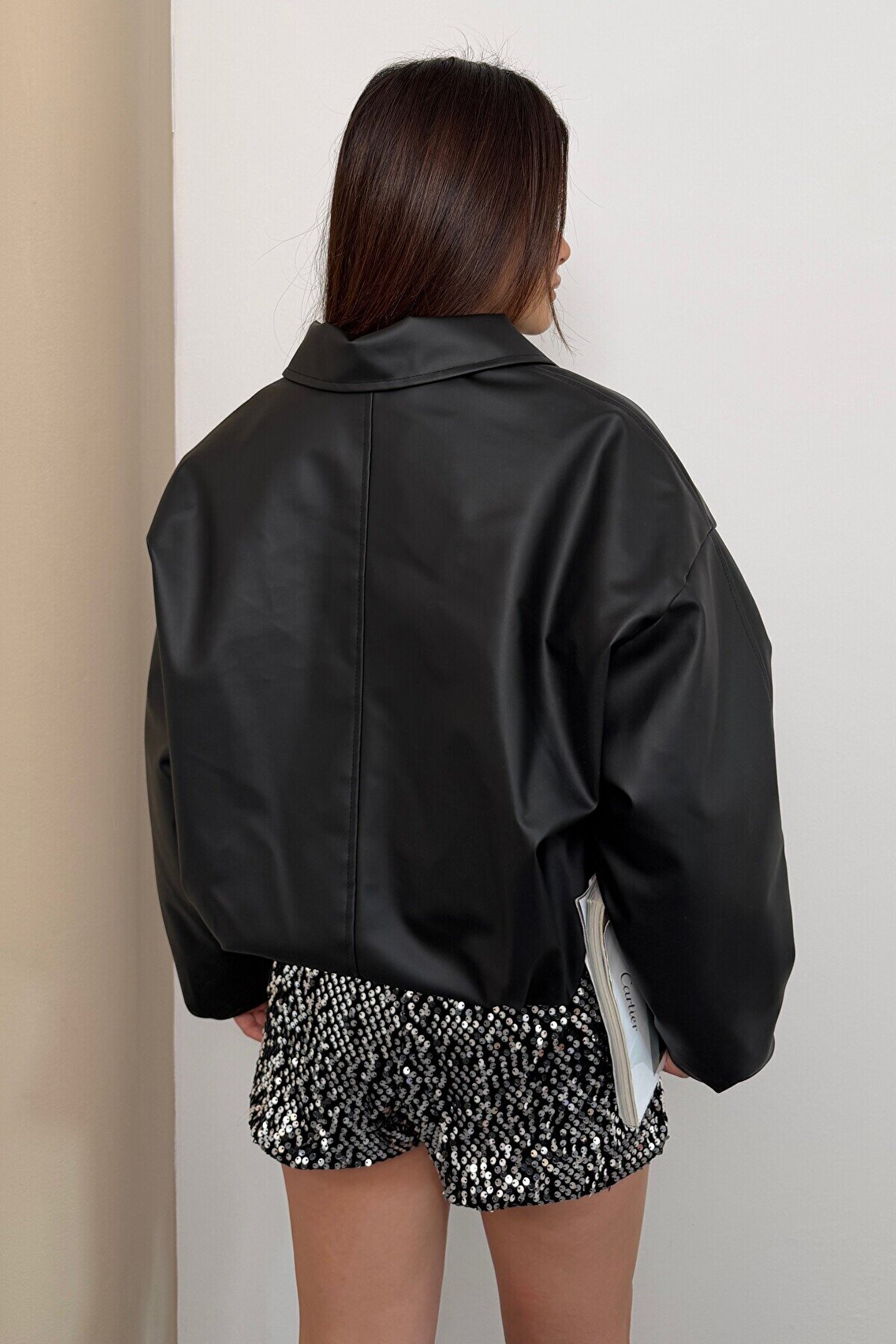 • Kış aylarında soğuktan korunmak için ideal, içi kürklü ve su itici özelliklere sahip oversize deri ceket.