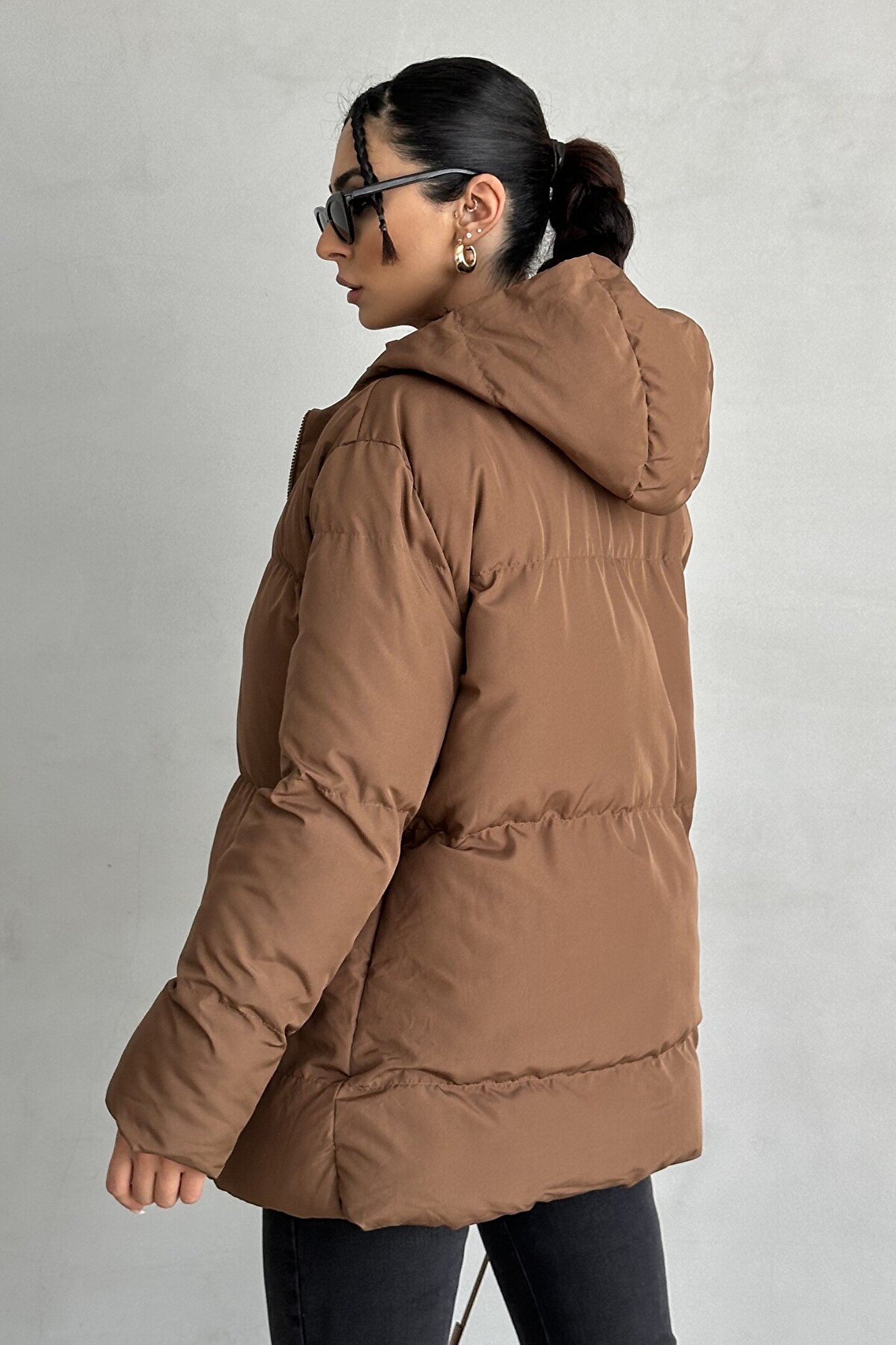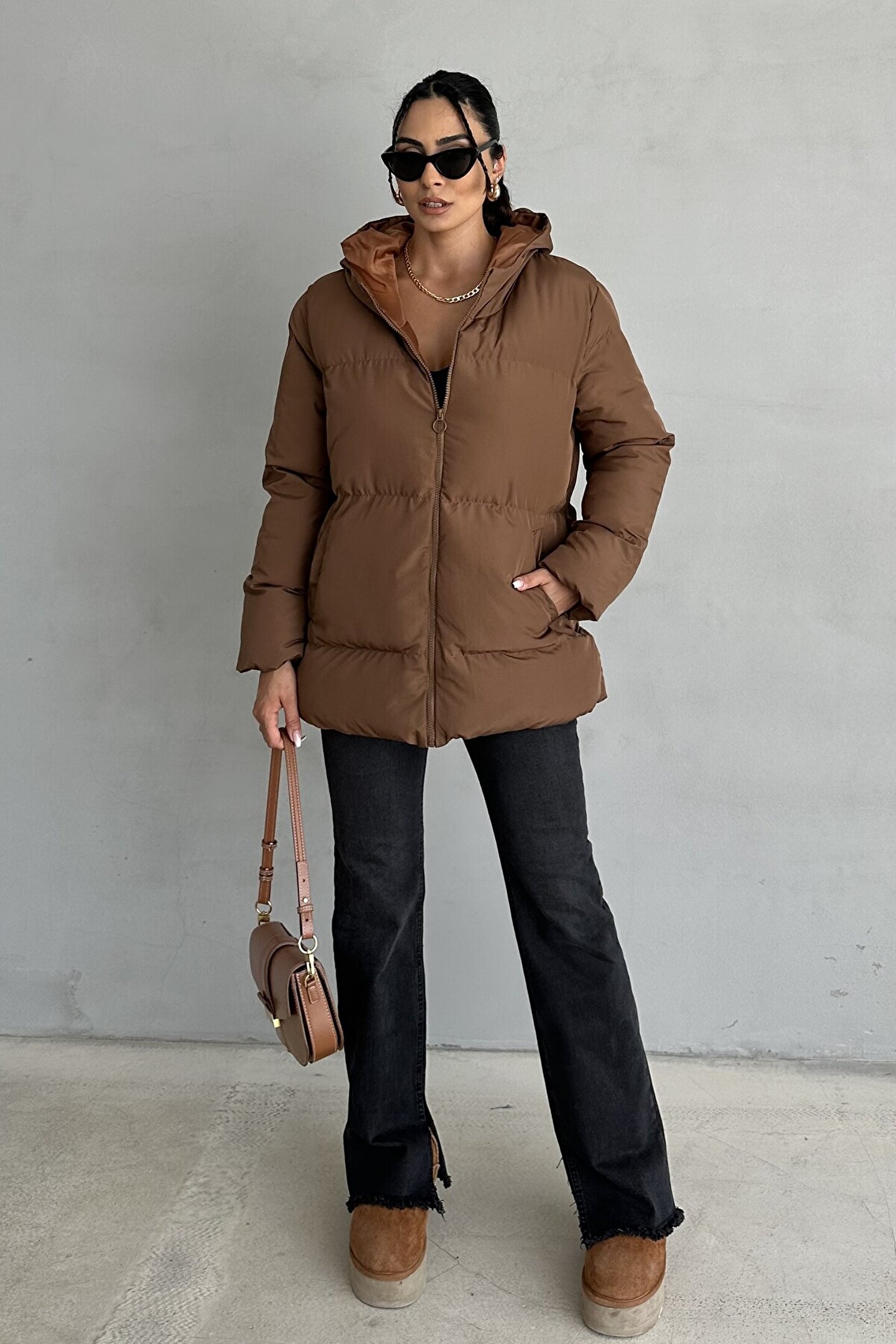 moda armanc Kadın Kahverengi Kapüşonlu Şişme Mont