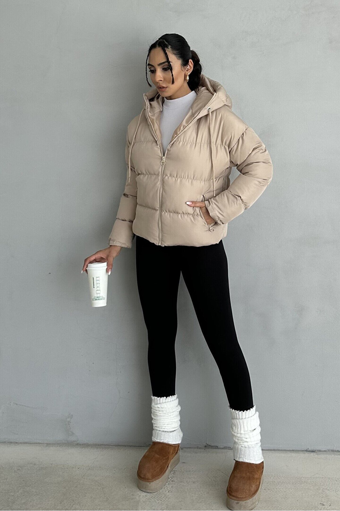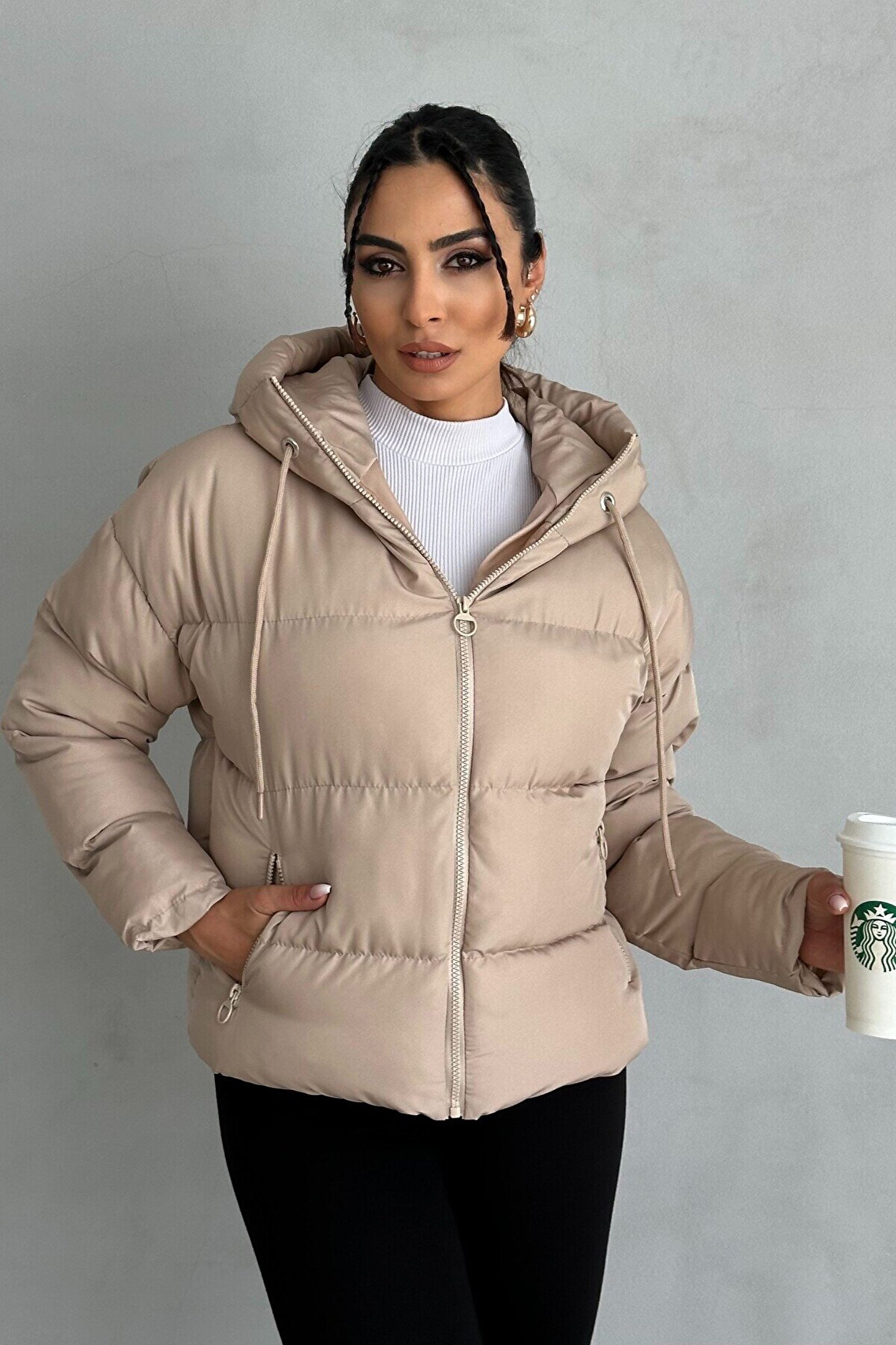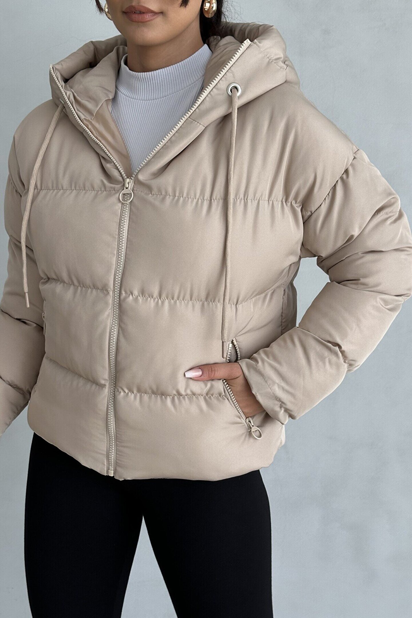 moda armanc Kadın Kapüşonlu Şişme Mont - Yakası Bağcıklı