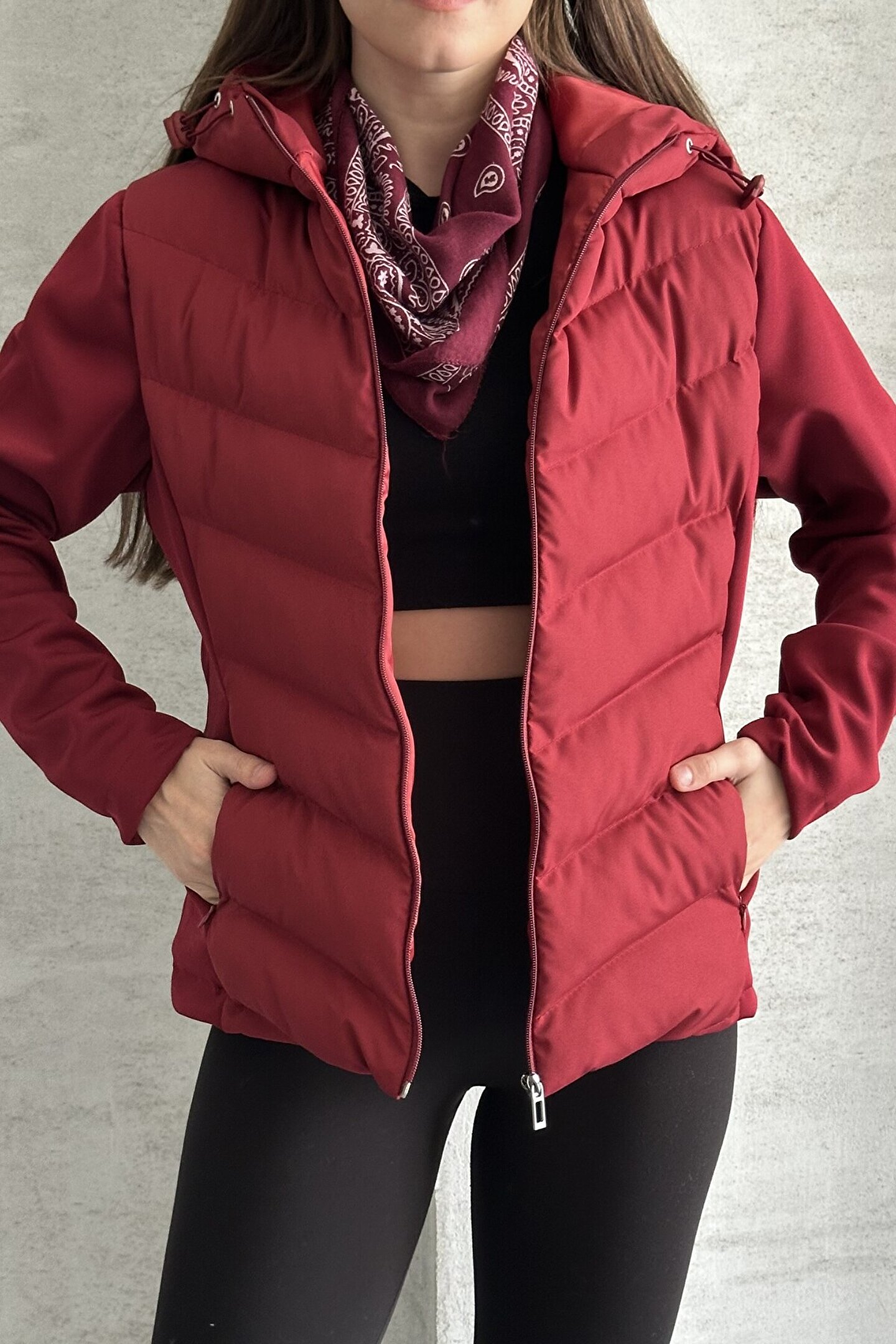 • Kadın bordo kapüşonlu şişme mont, şarap kırmızısının sofistike tonu ile günlük kombinlere iddialı ama zarif bir hava katar.