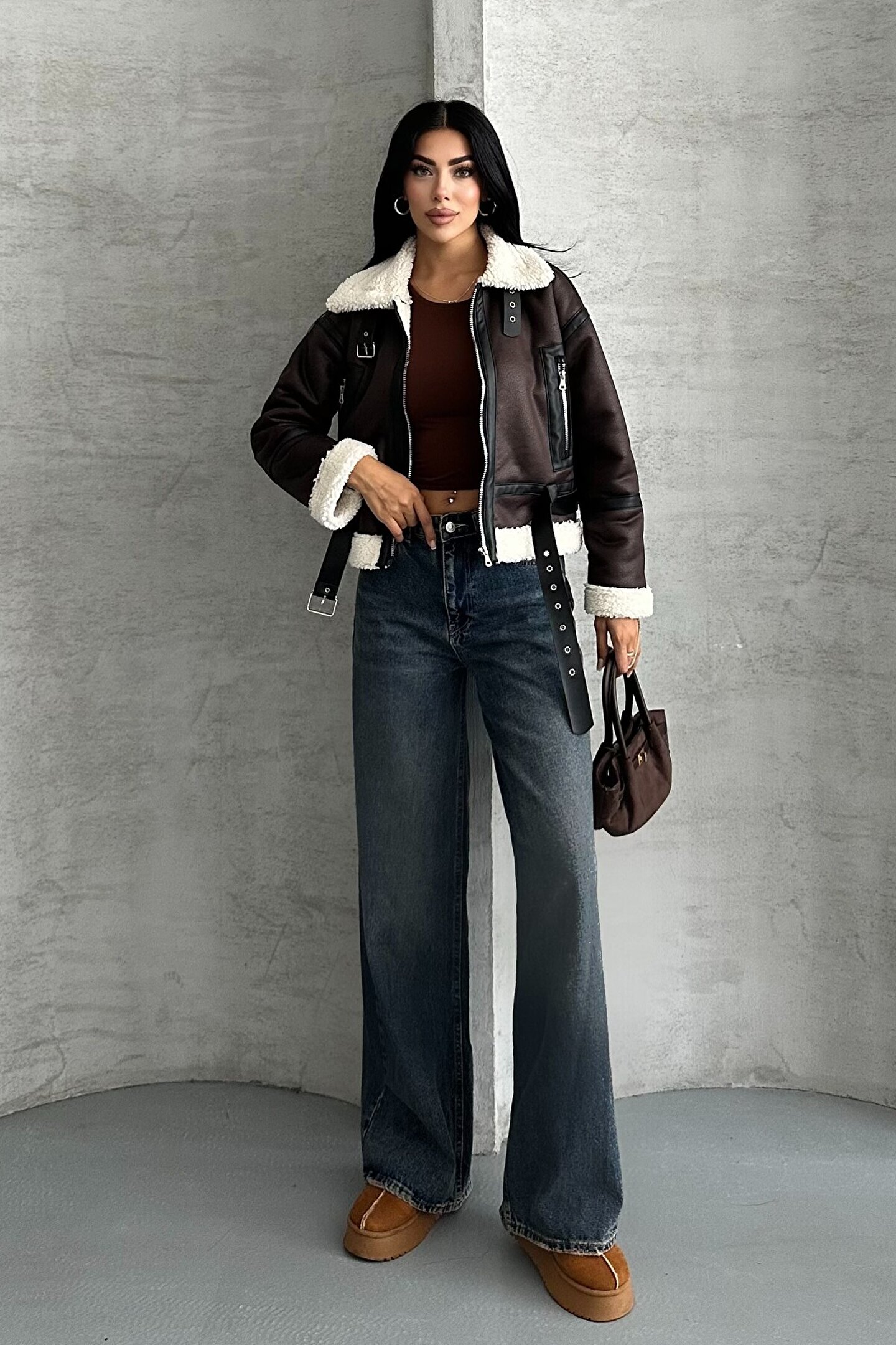 moda armanc Kadın Kemerli İçi Kürklü Deri Mont - Biker Deri Ceket