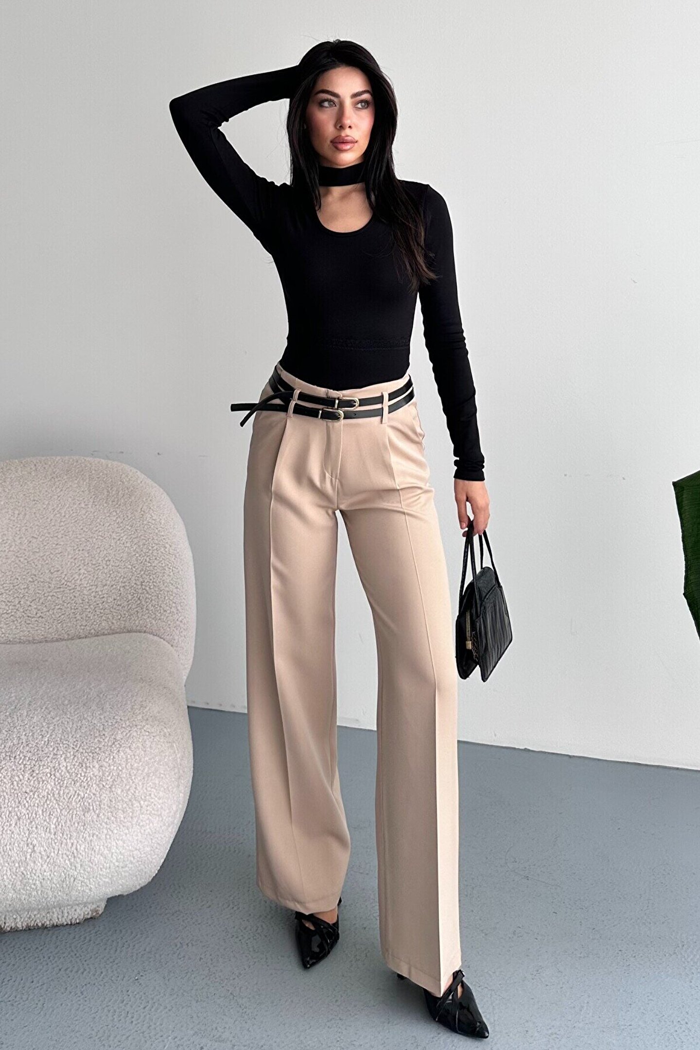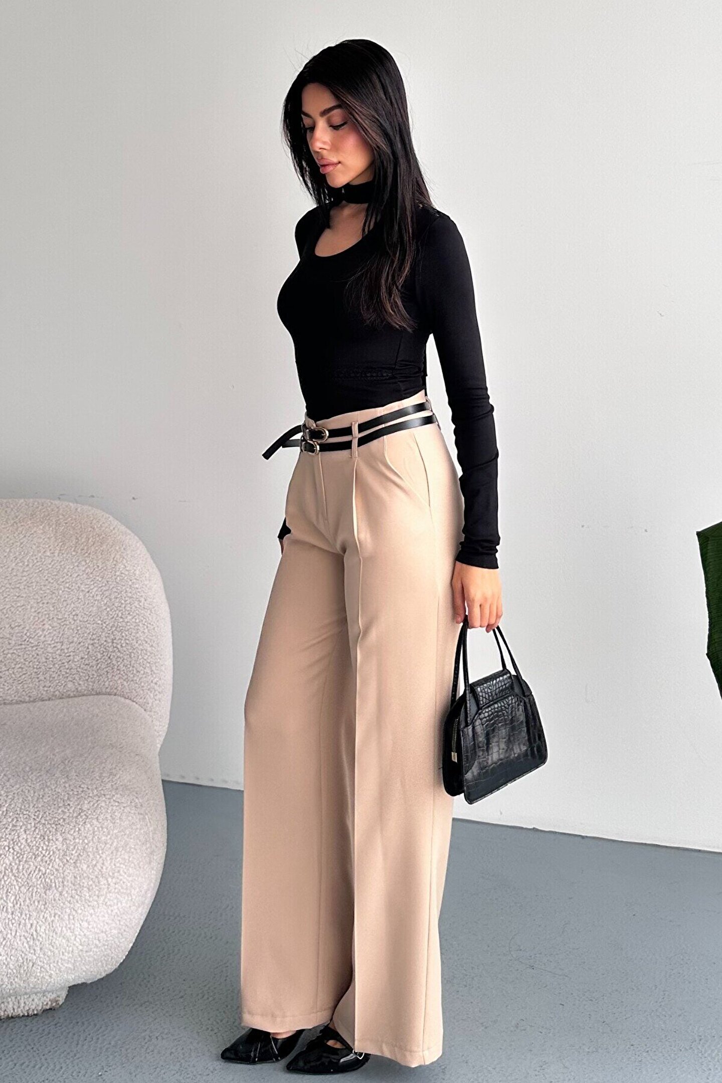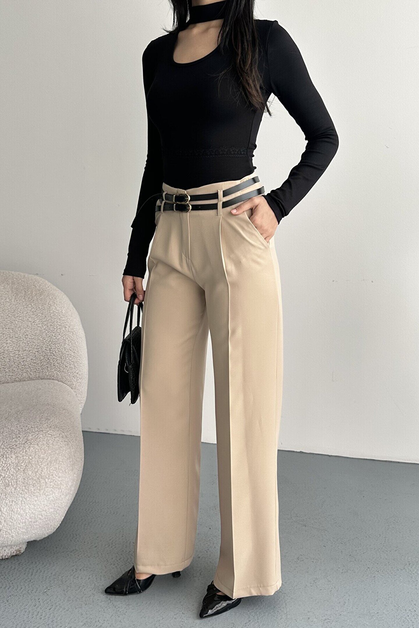 moda armanc Kadın Palazzo Pantolon Kemerli | Yüksek Bel Bol Paça Günlük Çift Kemerli Tasarım