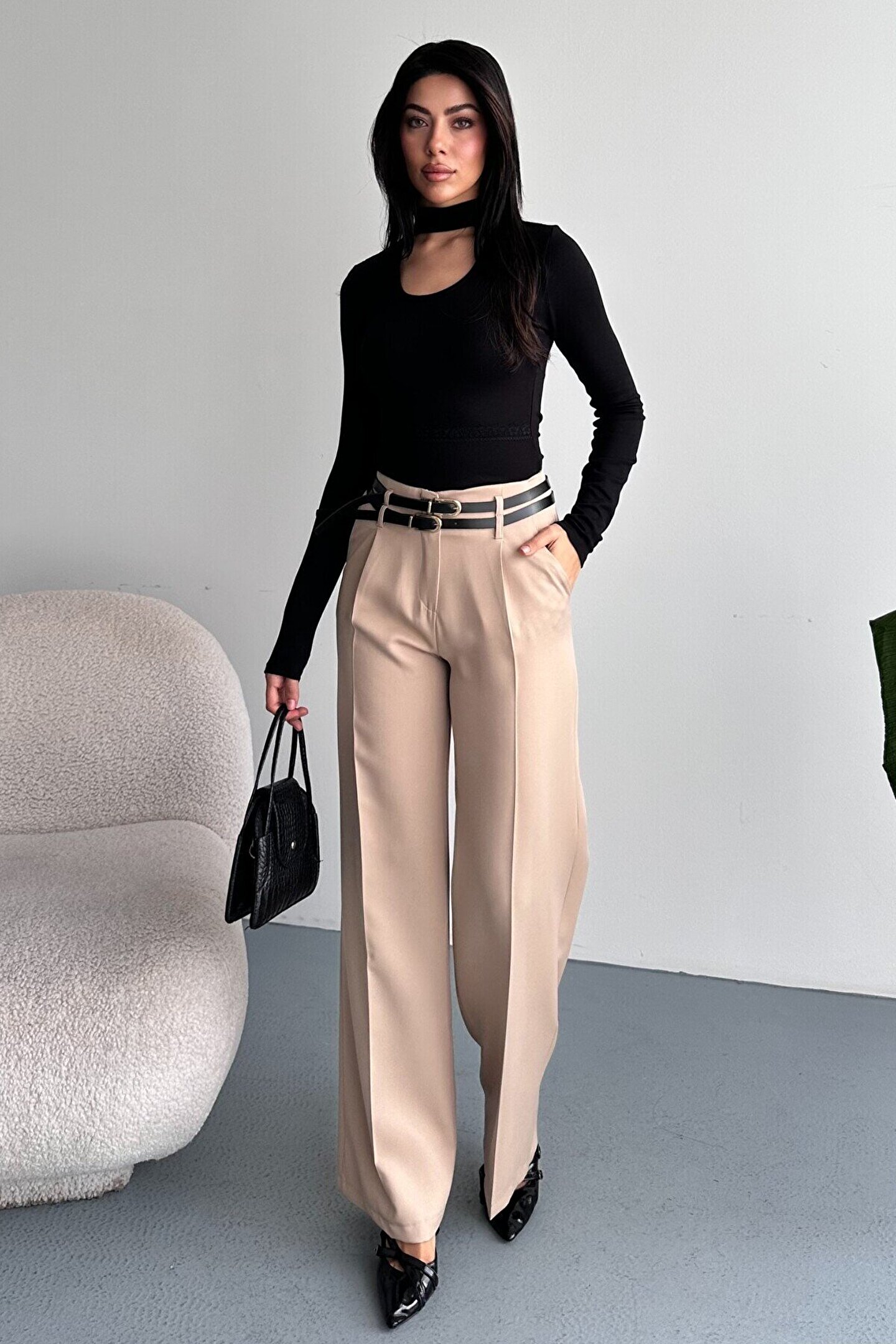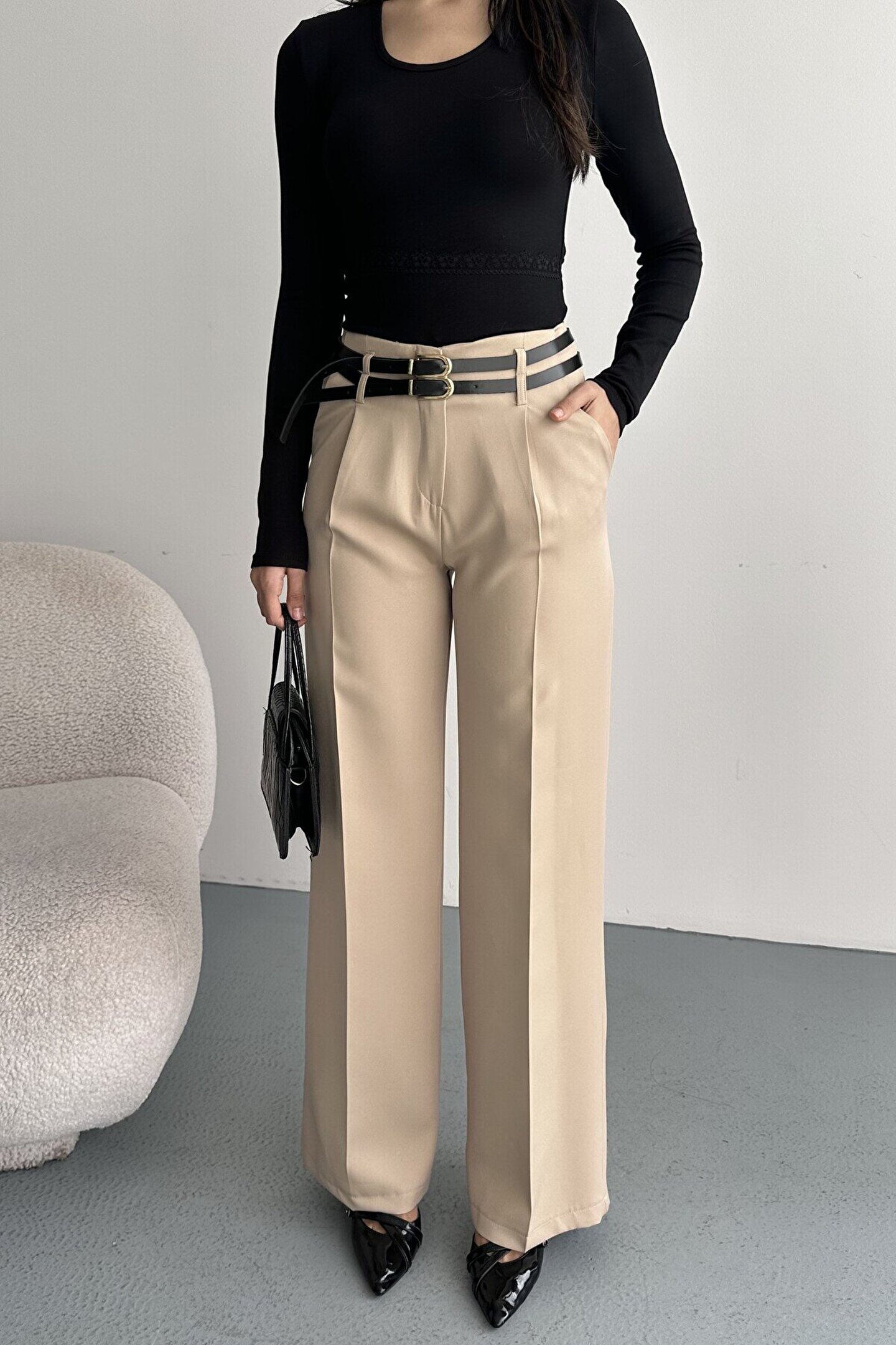 moda armanc Kadın Palazzo Pantolon Kemerli | Yüksek Bel Bol Paça Günlük Çift Kemerli Tasarım