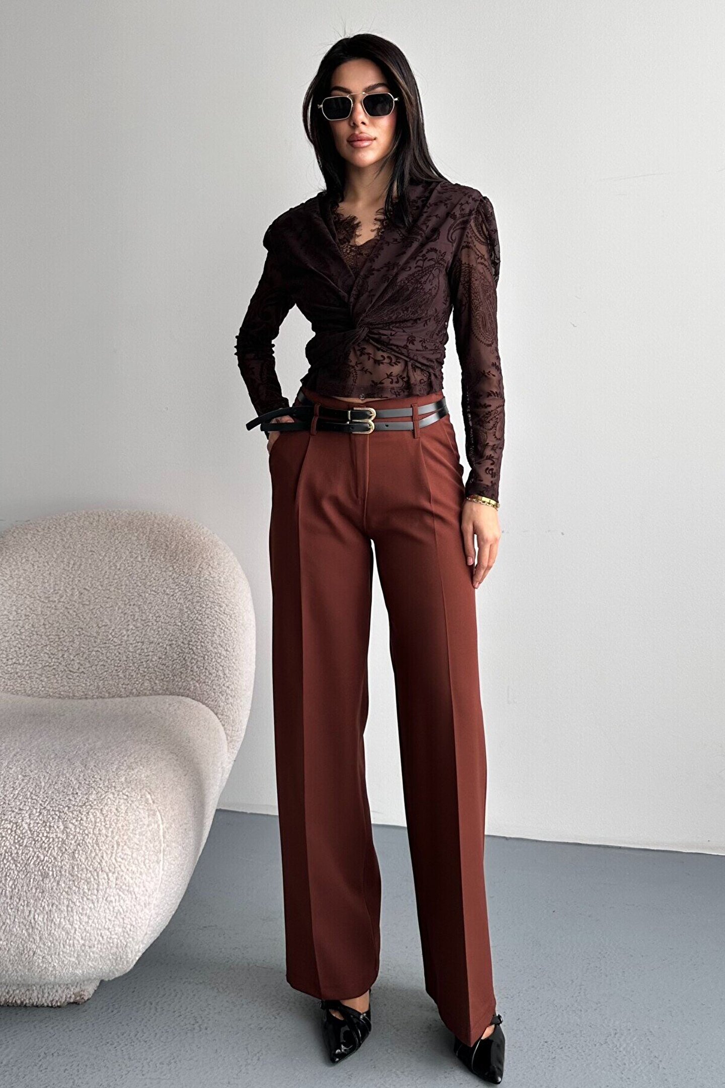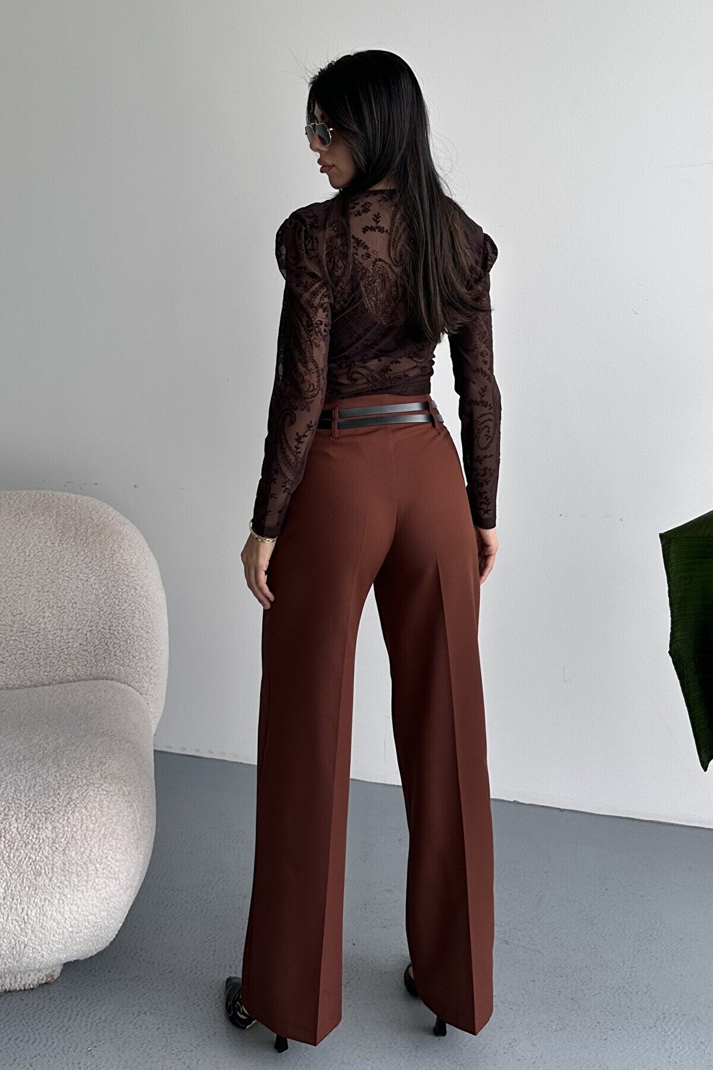 • Yüksek bel formu, çift kemer tasarımı ve bol paça kesimiyle gün boyu şıklık ve konfor sunan kadın palazzo pantolon. Ofis ve günlük kombinler için ideal.