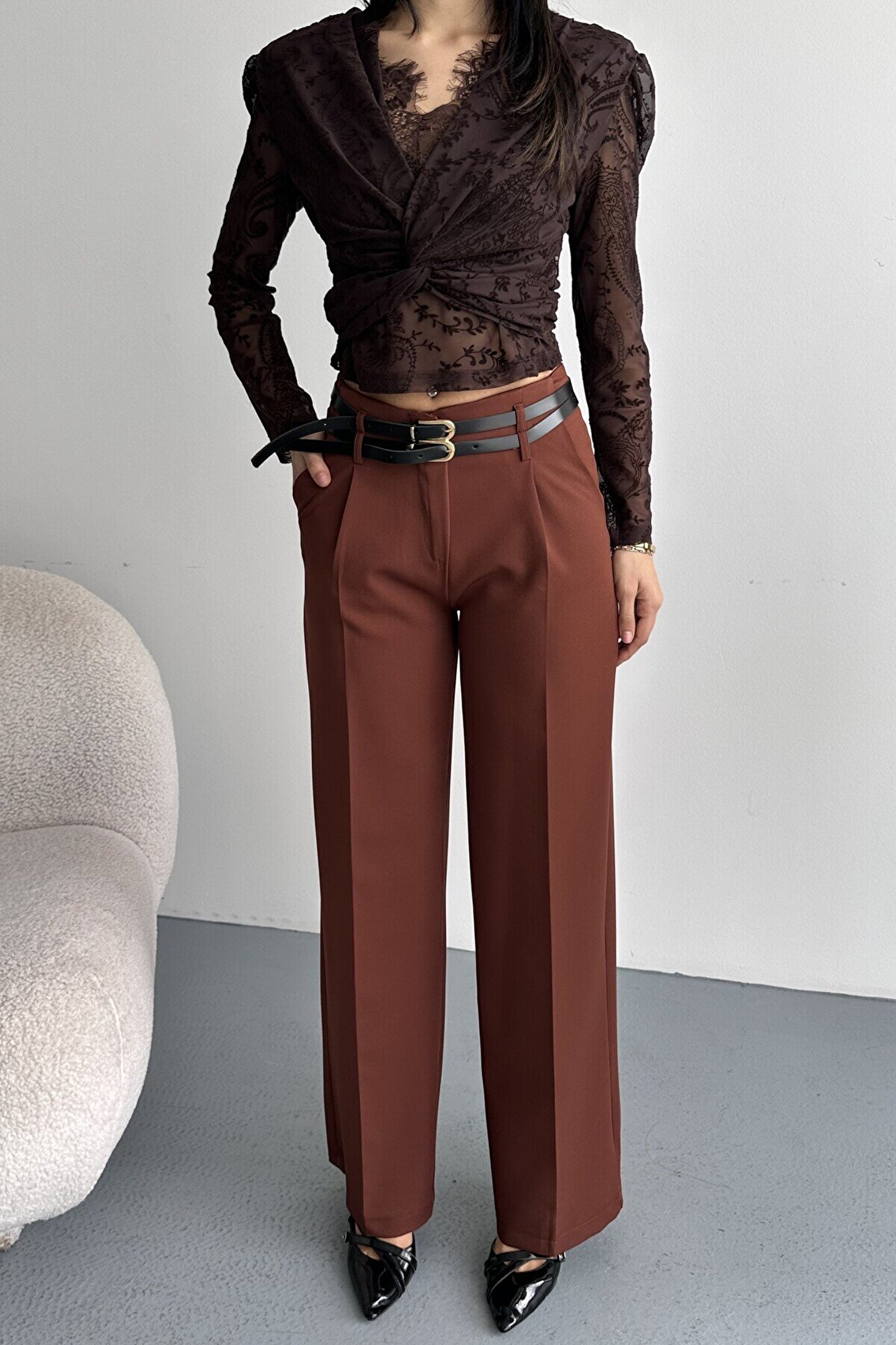 moda armanc Kadın Palazzo Pantolon Kemerli | Yüksek Bel Bol Paça Günlük Çift Kemerli Tasarım