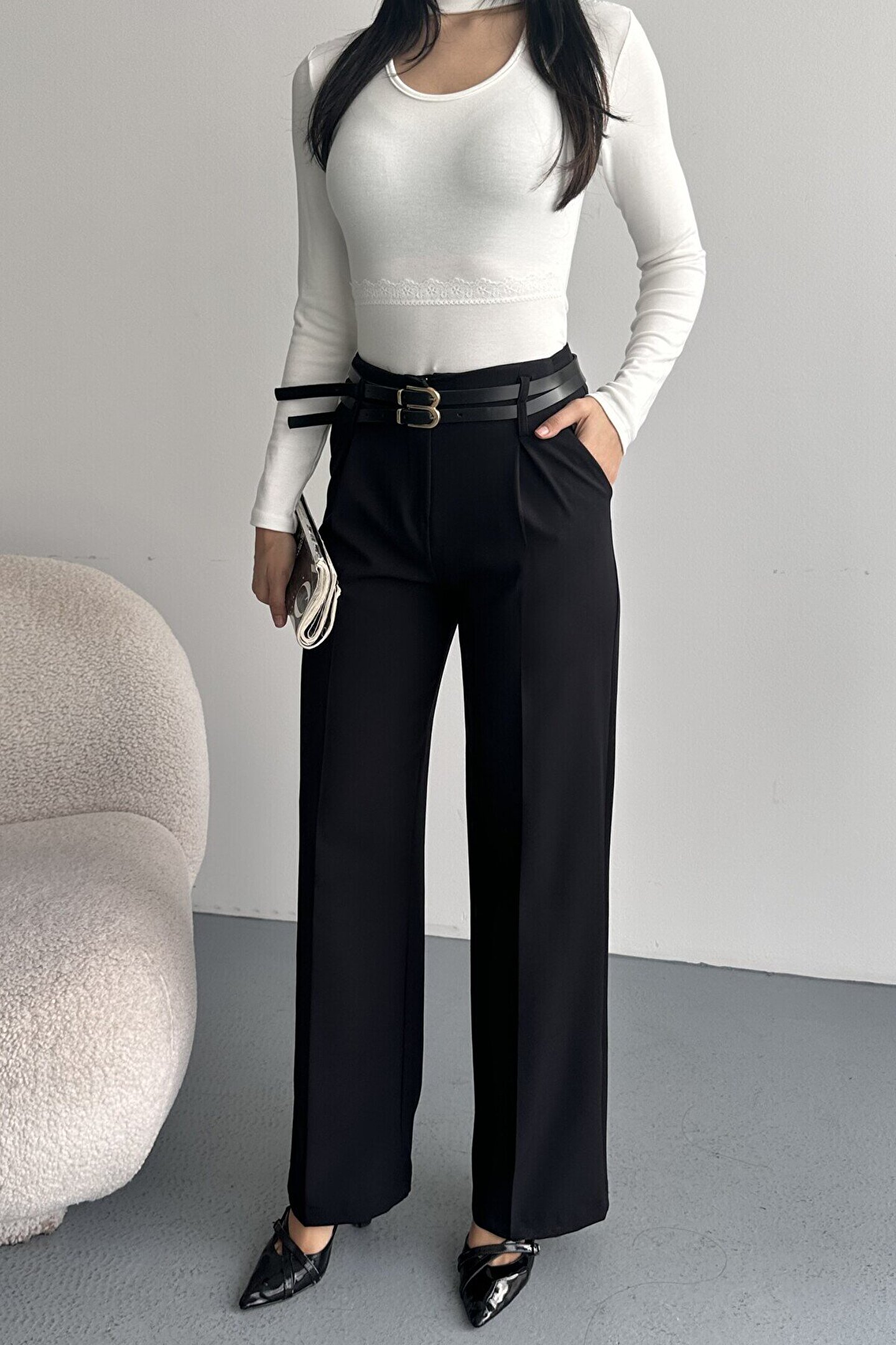 moda armanc Kadın Palazzo Pantolon Kemerli | Yüksek Bel Bol Paça Günlük Çift Kemerli Tasarım