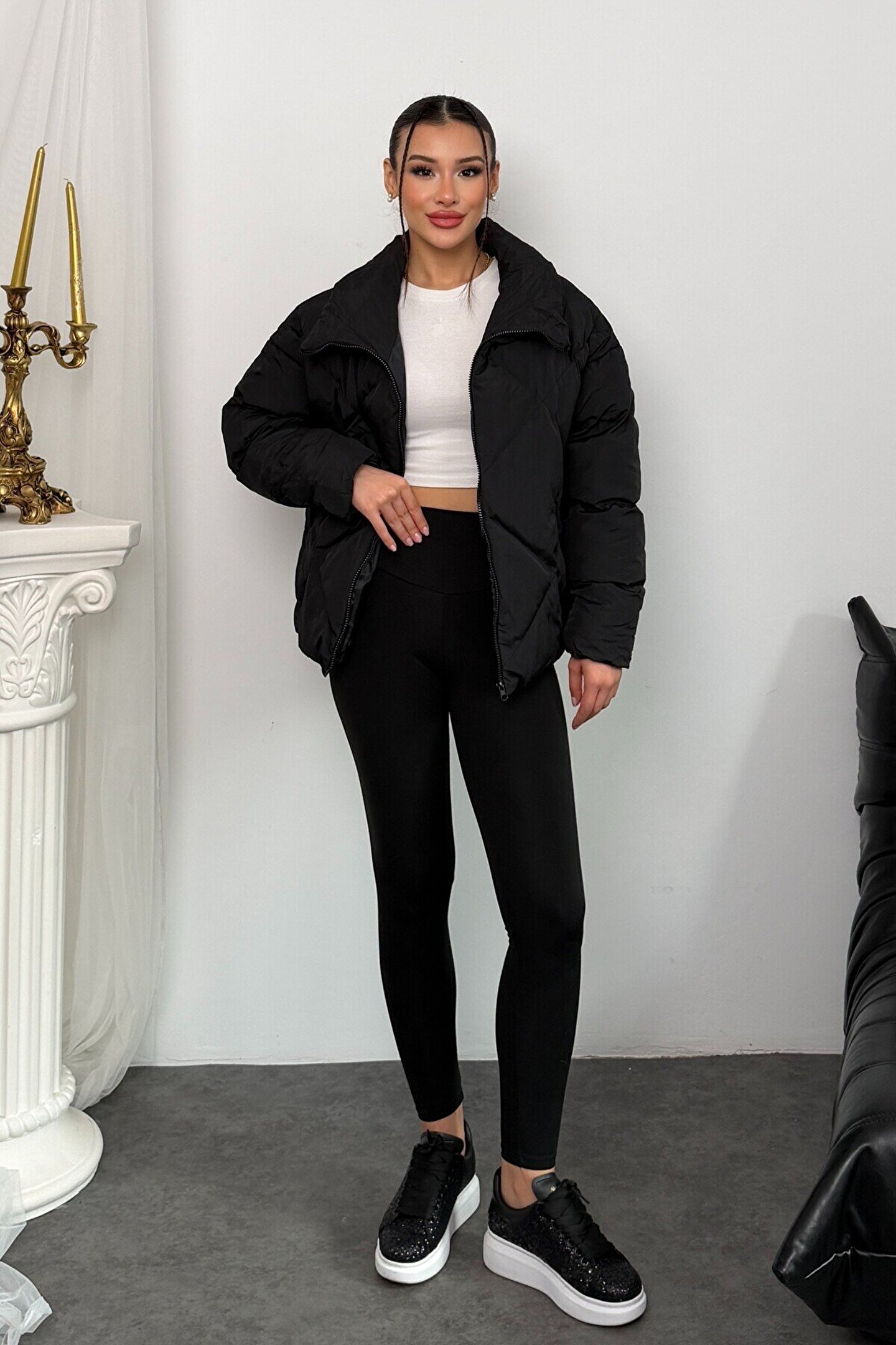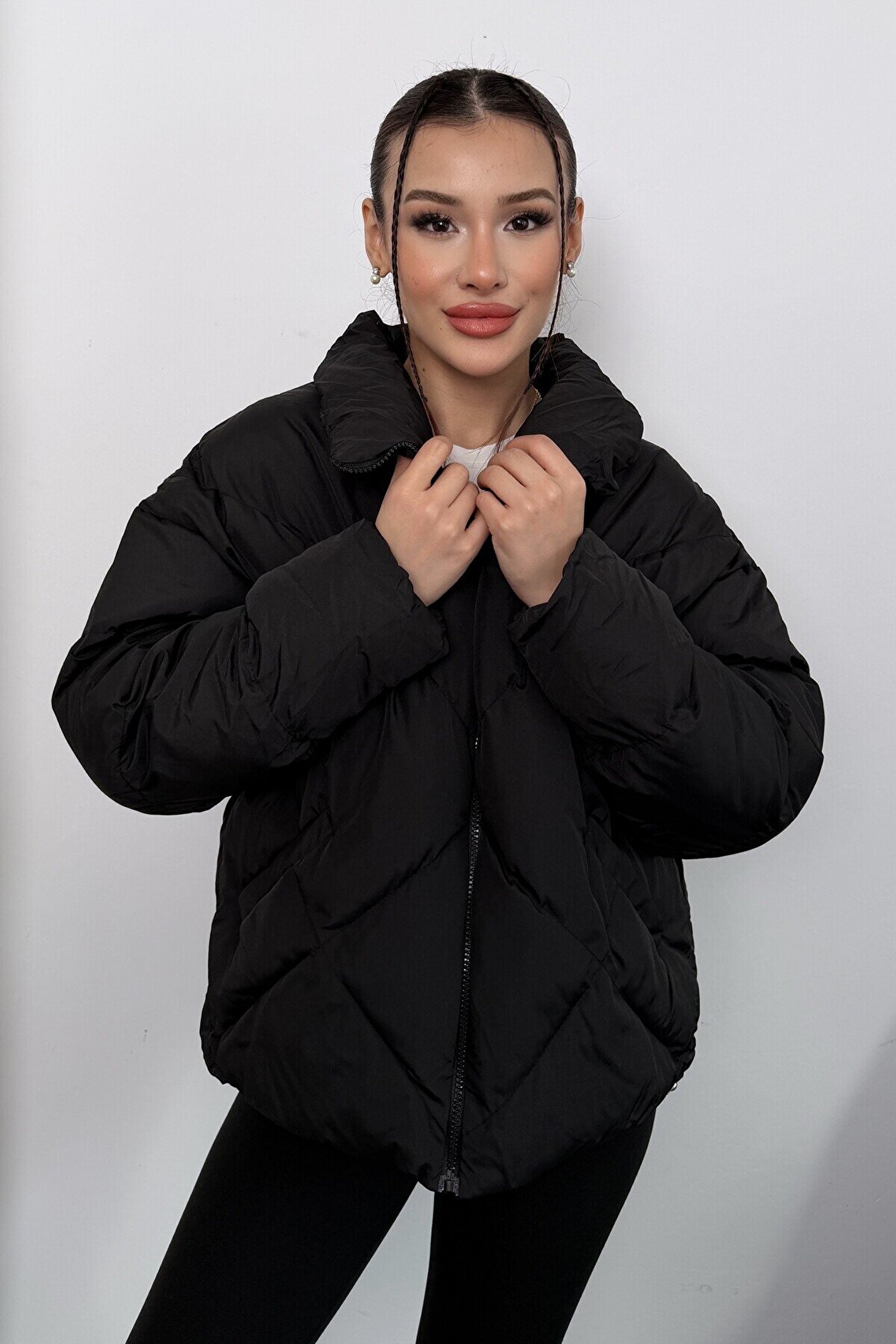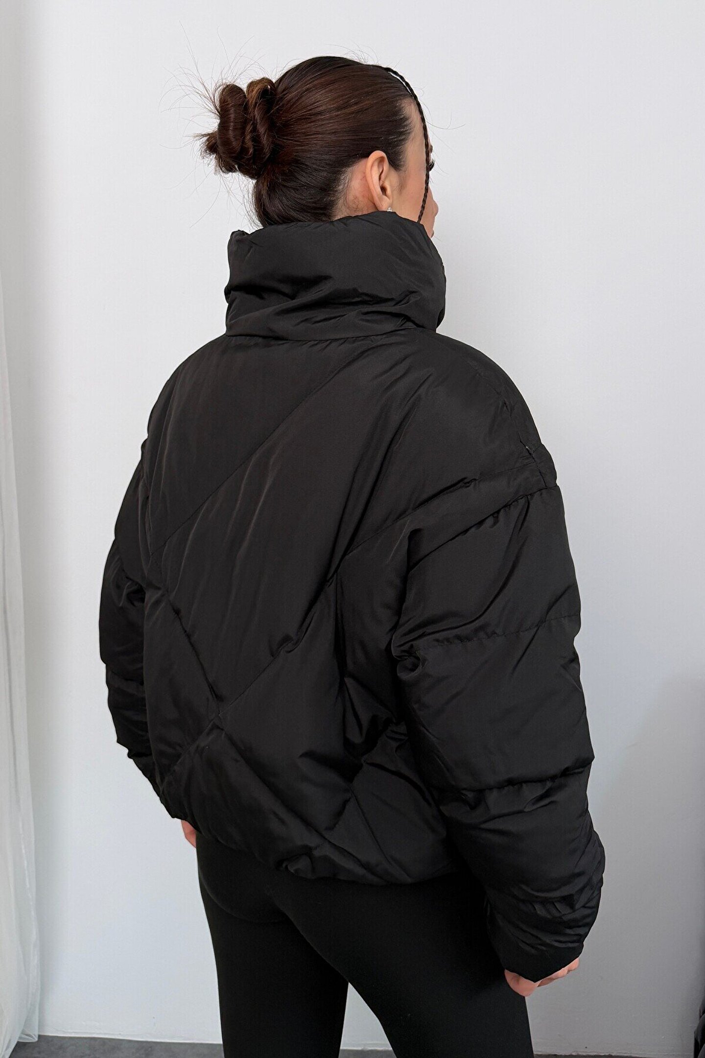 moda armanc Kadın Siyah Oversize Şişme Mont - Yüksek Yaka, Baklava Desenli