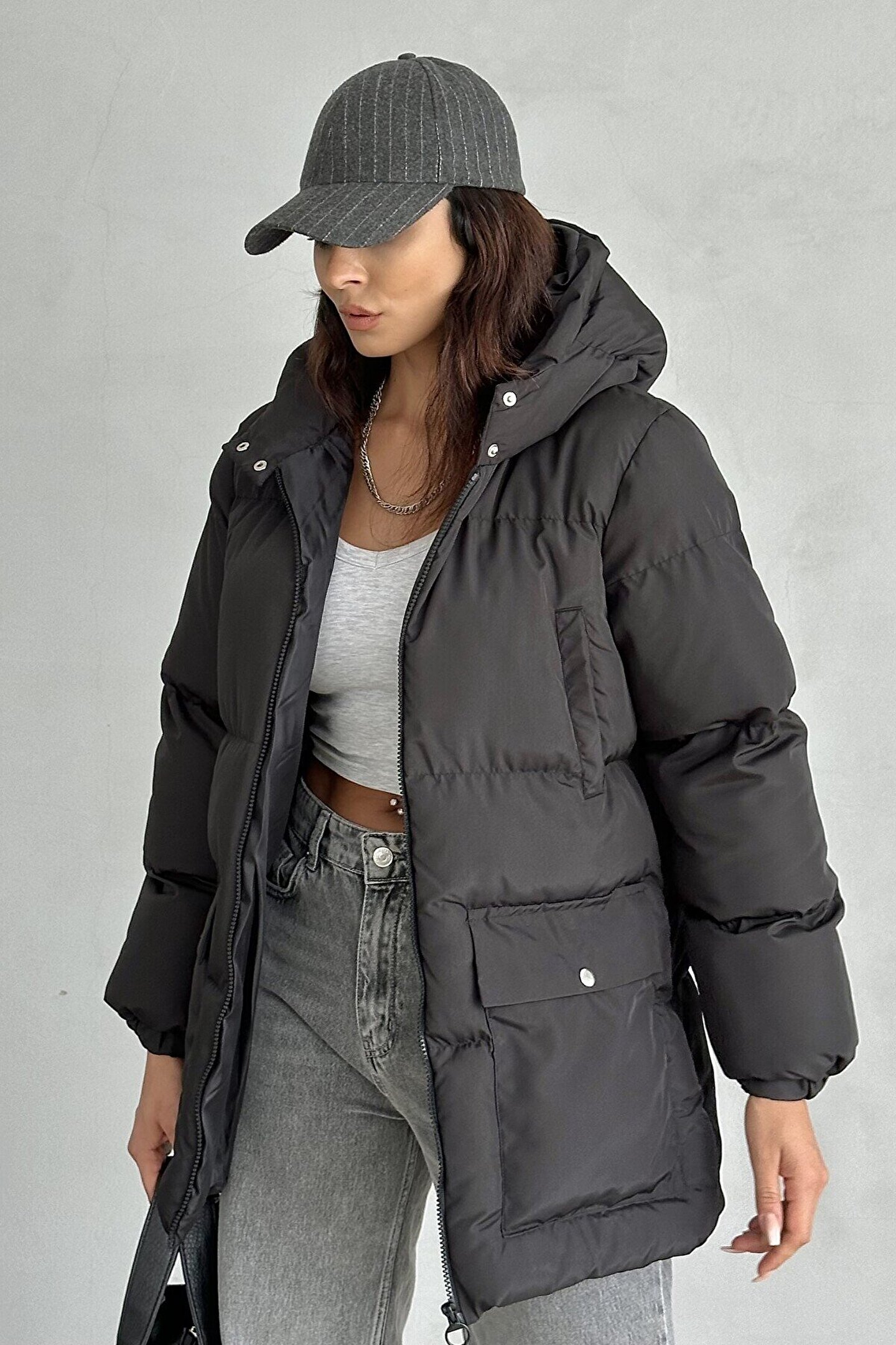 moda armanc Kapüşonlu Oversize Kadın Siyah Şişme Mont - 4 Cep Detaylı