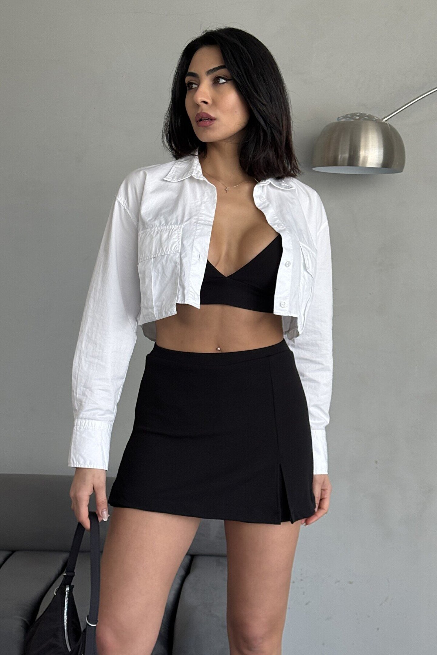 Model Ölçüleri: Boy: 172 Kilo: 58 (Modelin üzerindeki ürün S bedendir) ; Yaz sezonuna özel tasarlanmış siyah şort etek, günlük kullanım için idealdir.; ; Basic koleksiyonun sadeliğini yansıtan bu şort etek, her gardıropta temel parçalardan biridir.; ; Yıkama talimatlarına uygun şekilde bakım yapıldığında uzun ömürlü kullanım vaat eder.; ; Yırtmaç detayı sayesinde hareket özgürlüğü kazandırırken şık bir görünüm sunar.; ; Mini boy kesimiyle yaz aylarının vazgeçilmez parçası haline gelirken vücut hatlarını zarifçe sararak dikkat çeker.