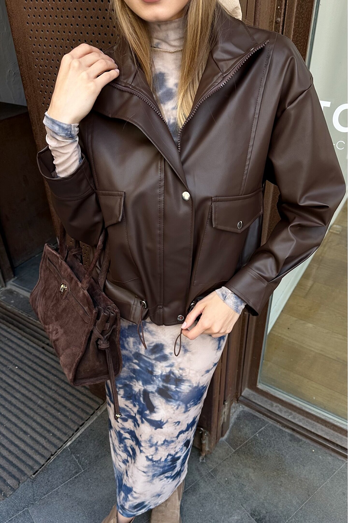 • Kahverengi oversize kadın deri ceket, sonbahar/kış sezonunun vazgeçilmez trendlerinden.
