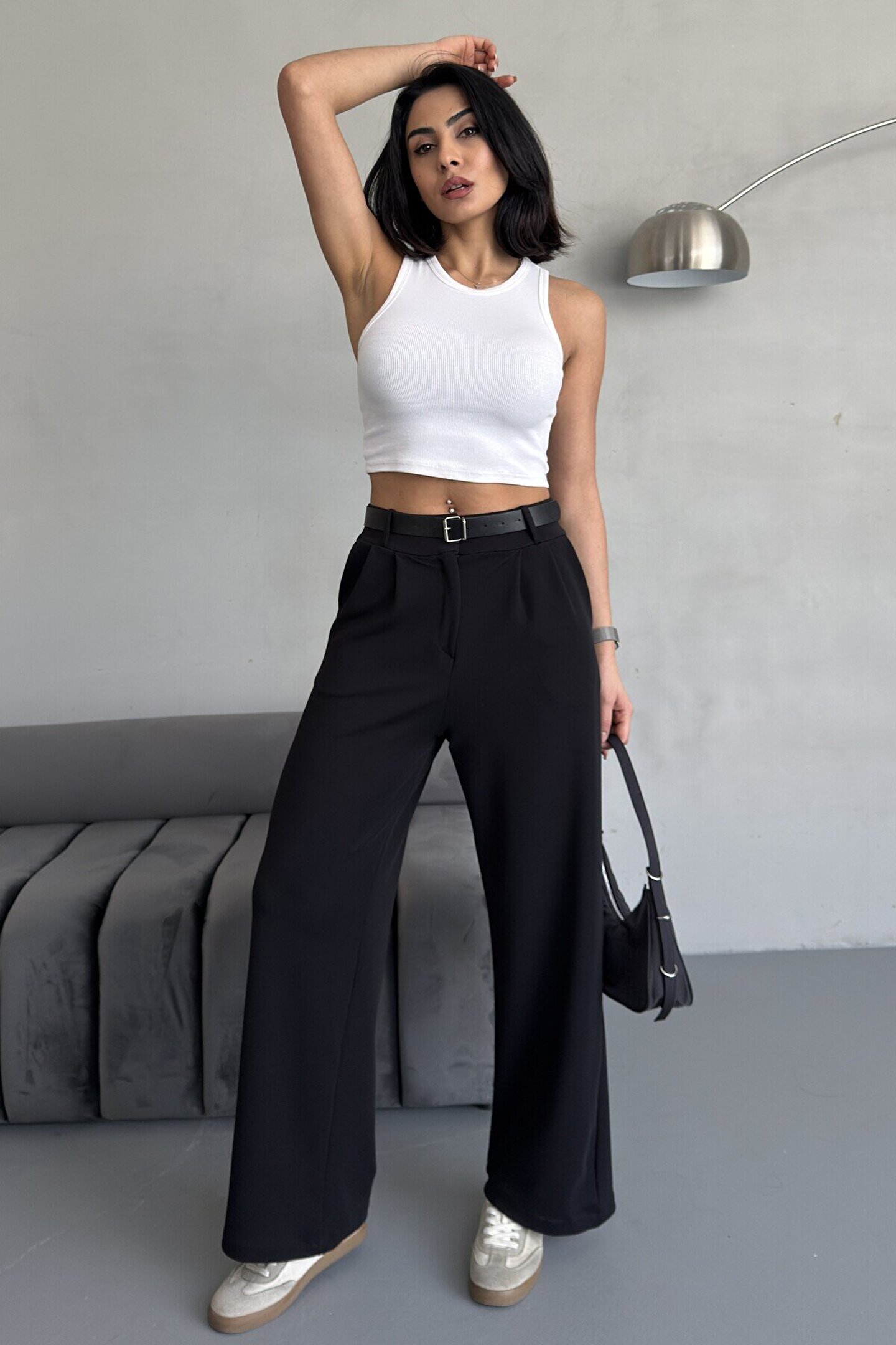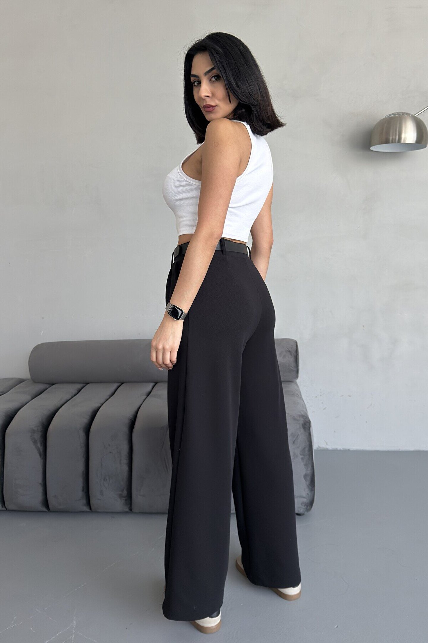 moda armanc Yüksek Bel Bol Paça Kemerli Likralı Kadın Palazzo Pantolon - Siyah