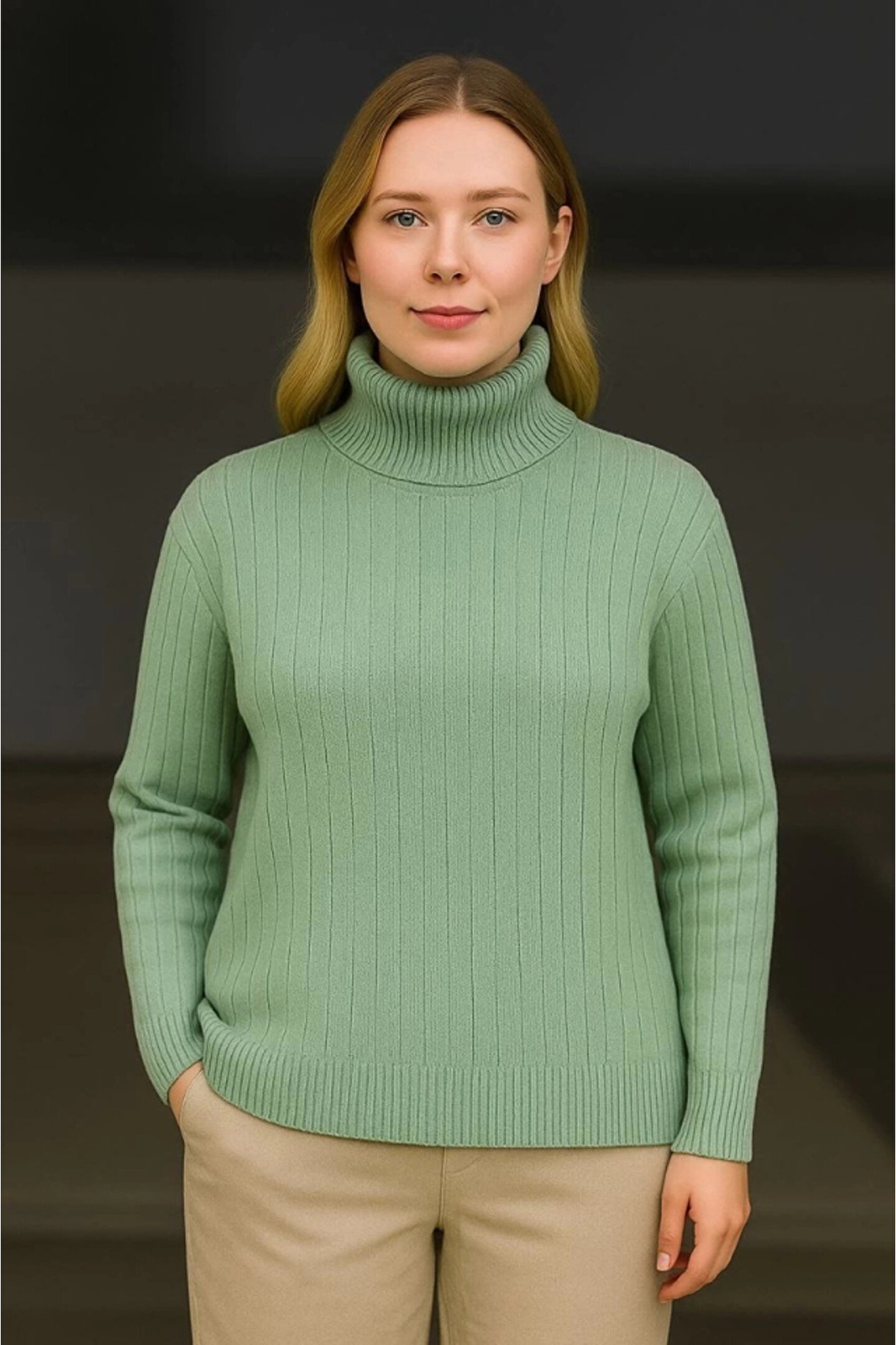 MODA Balıkcı Yaka Bağazlı Triko Kazak Pamuklu Kalın Fitilli Dokuma - Mint Yeşili