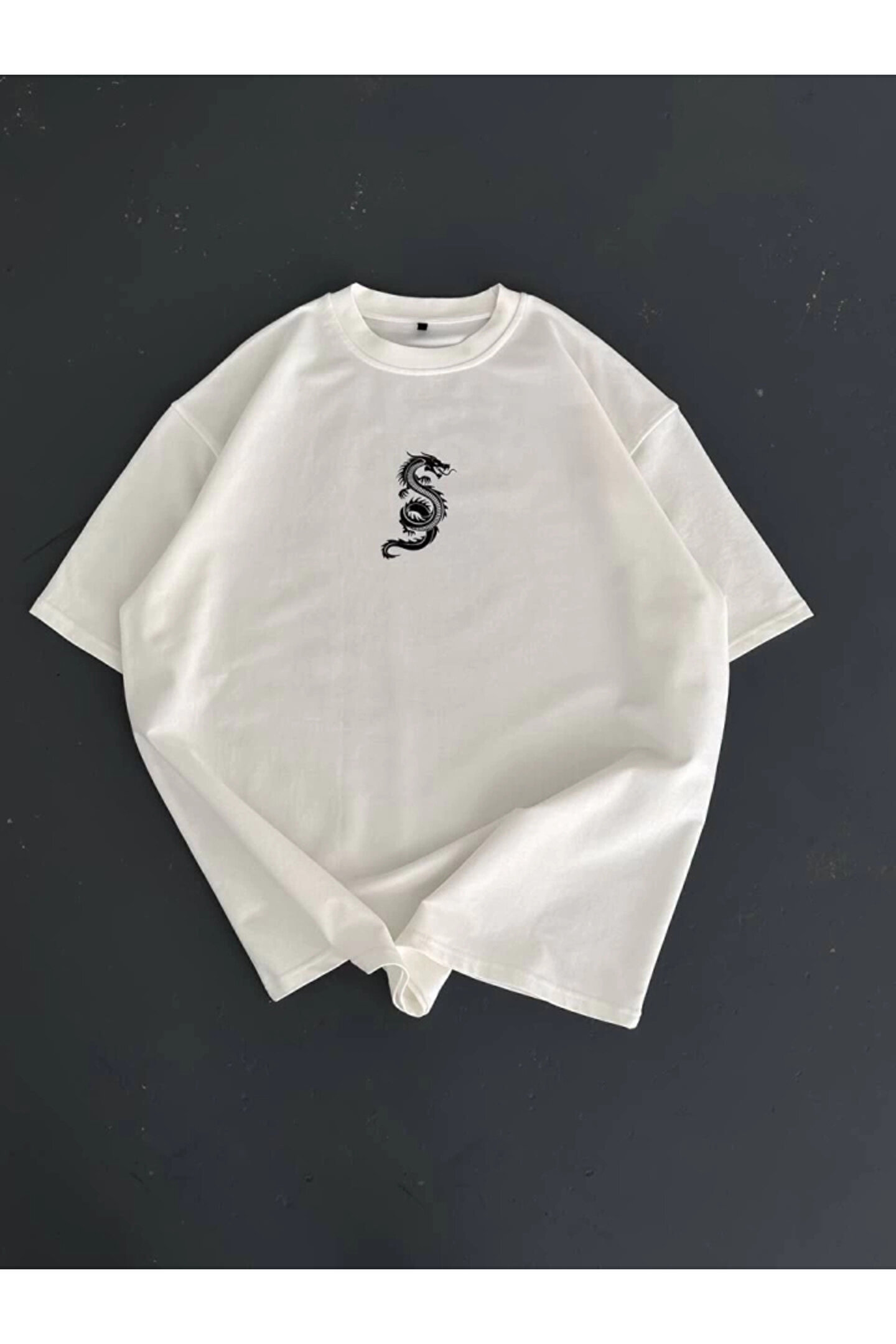 Baskılı Oversize Bisiklet Yaka T-shirt - Beyaz