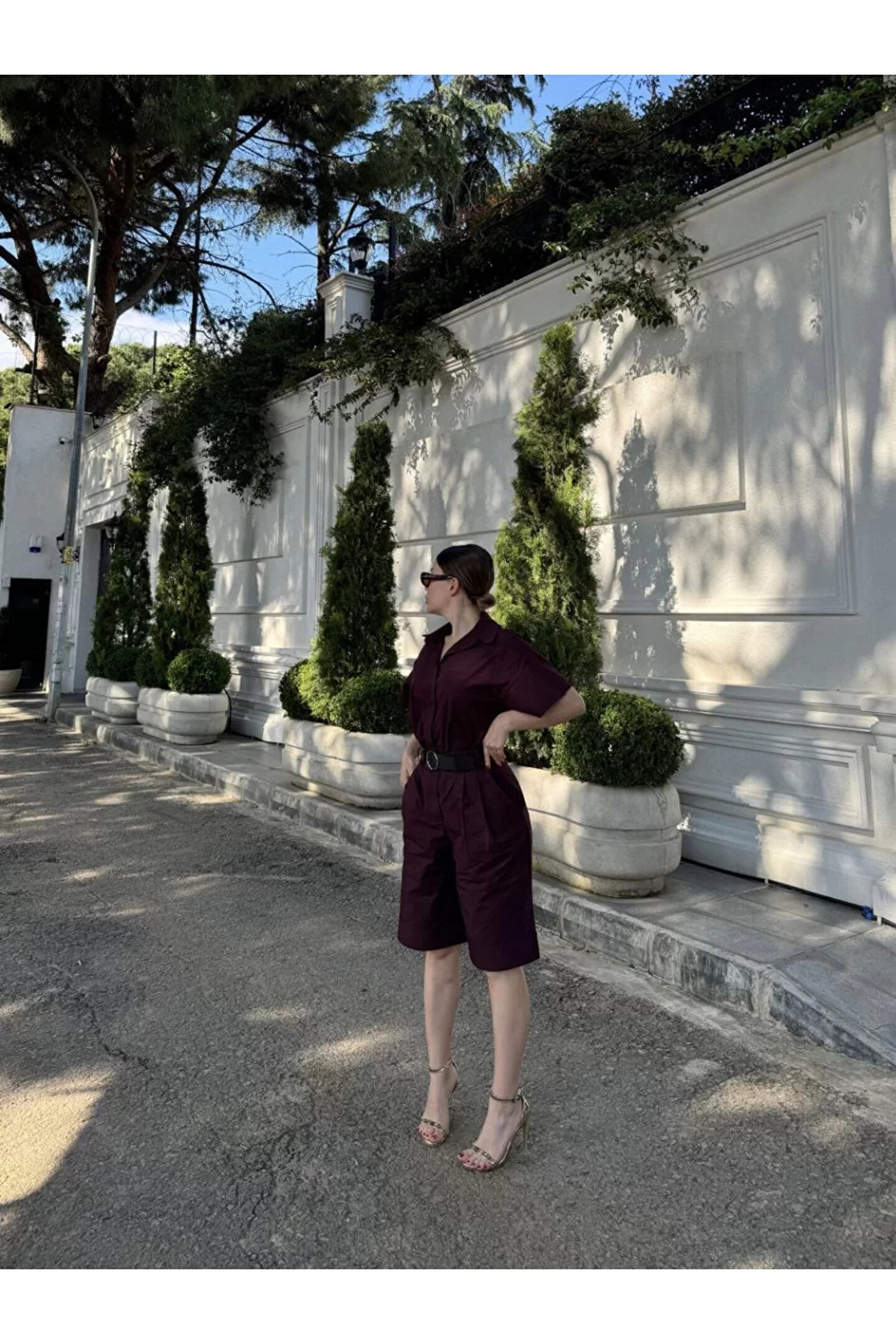 MODA Bordo Kemerli Gömlek Şort Kadın Takım