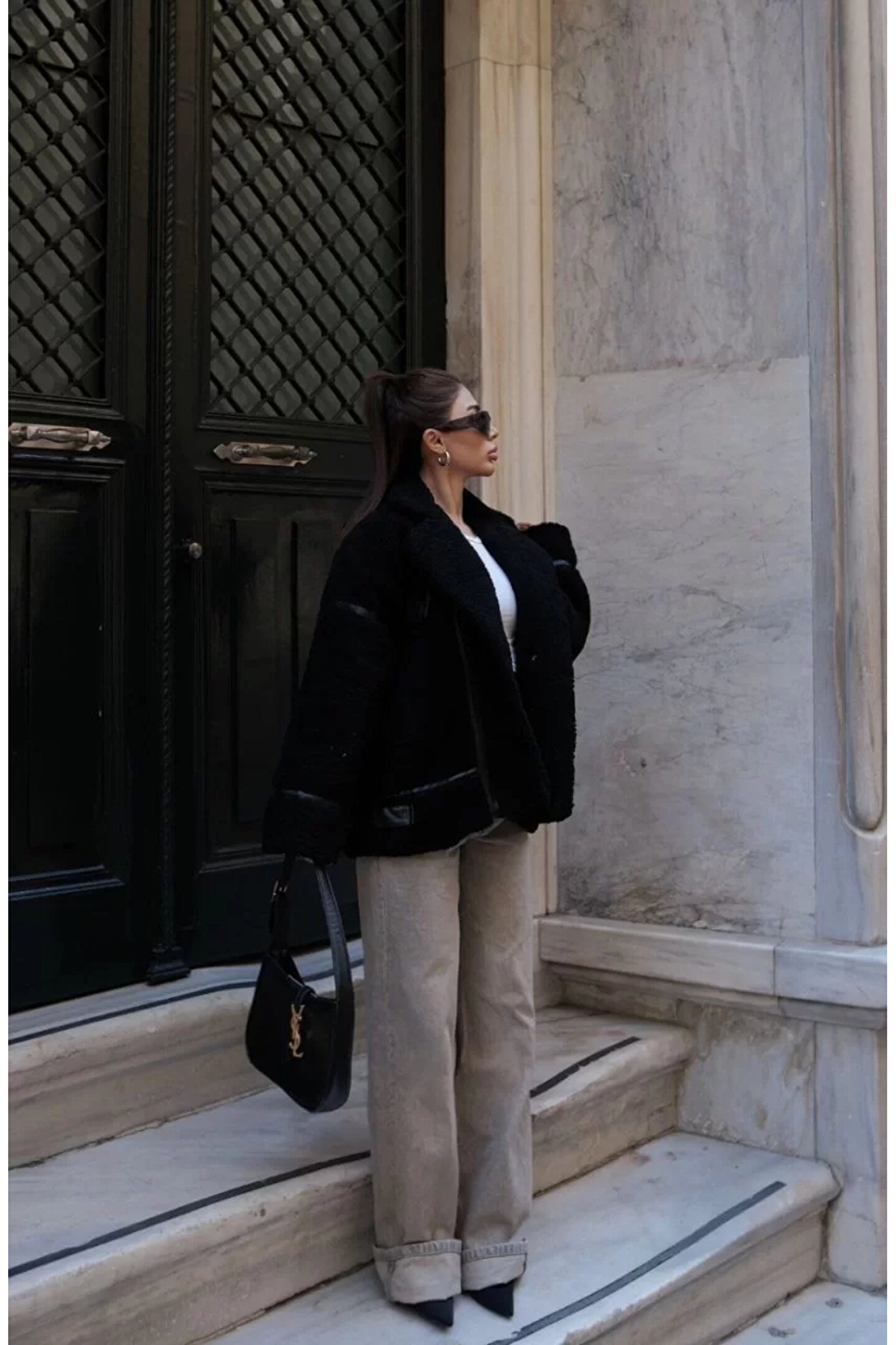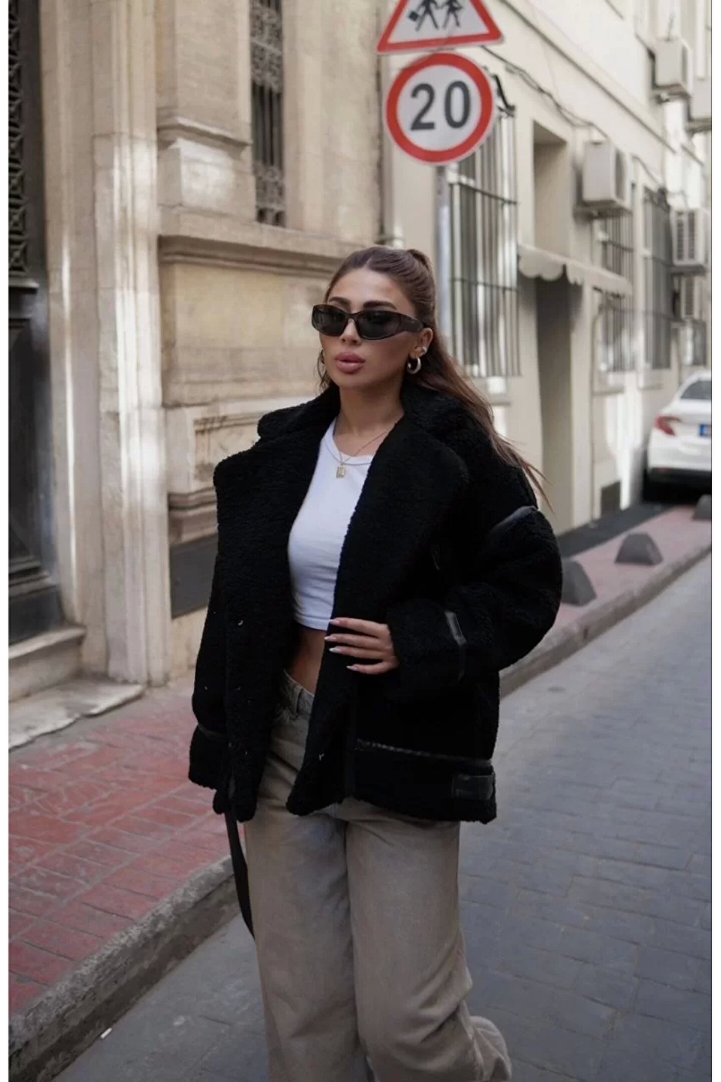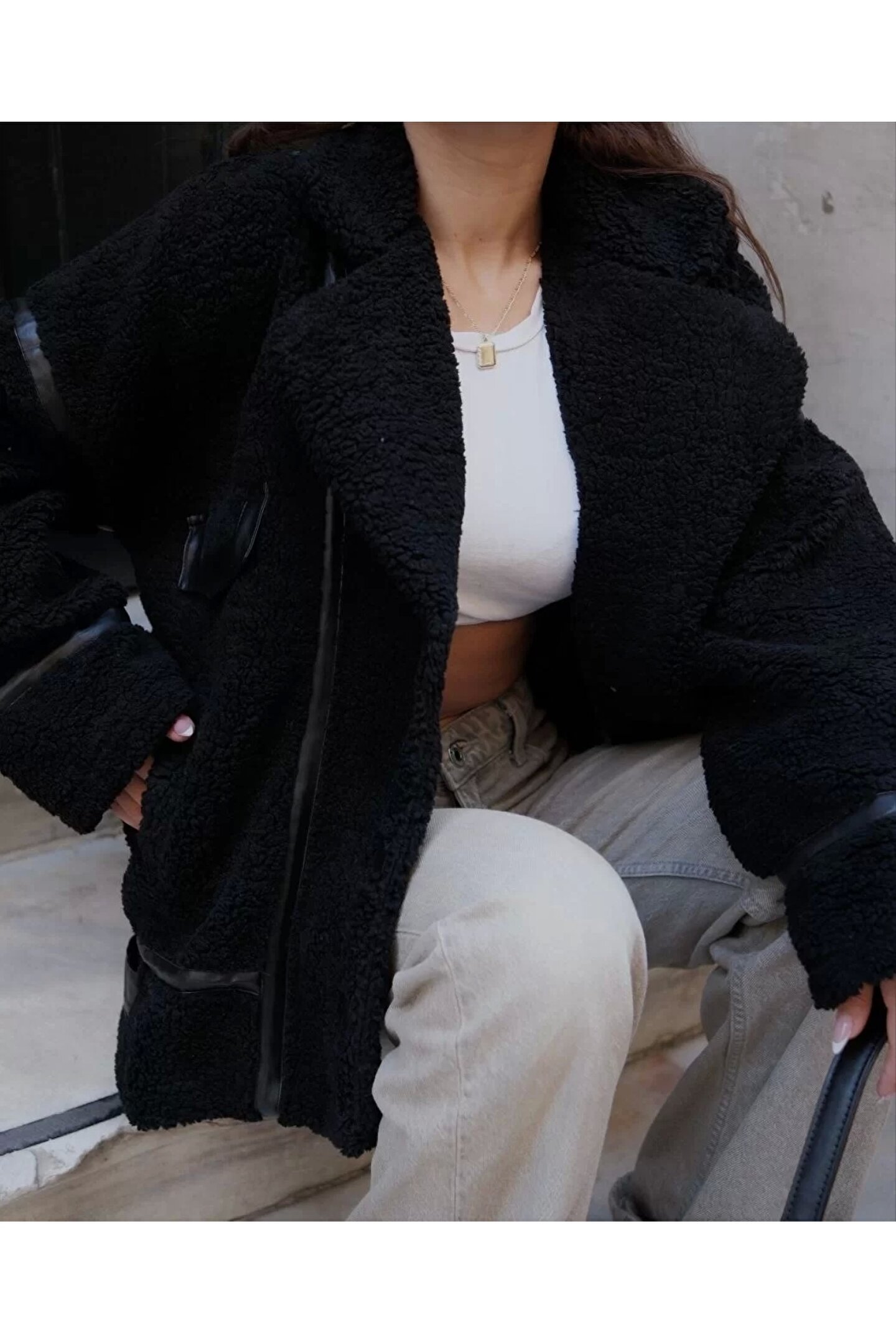 MODA Cıt Cıt Detaylı Peluş Mont Ceket - Siyah