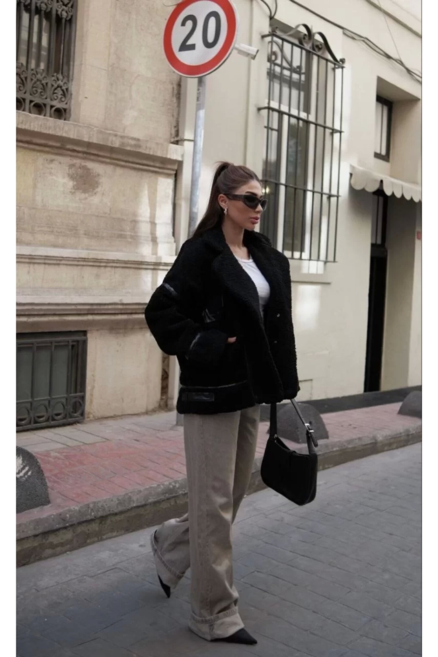 Cıt Cıt Detaylı Peluş Mont Ceket - Siyah