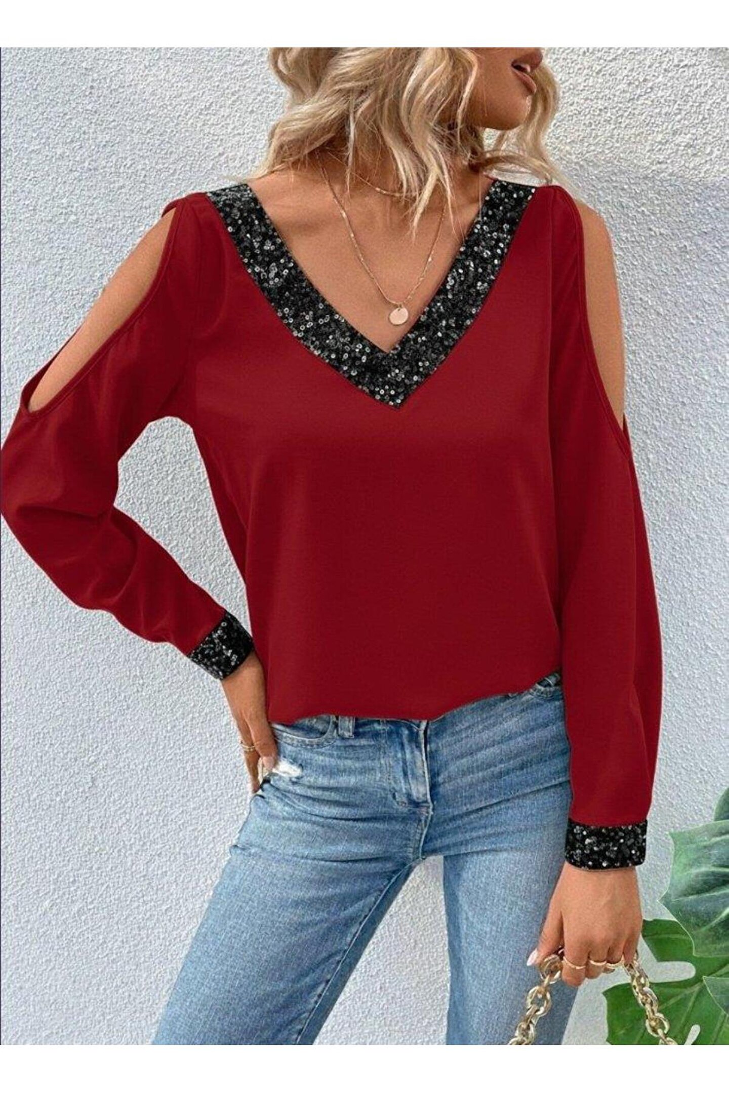 Moda Ebrar Kadın Uzun Kollu V Yakalı Omuzlardan Açık Sandy Bluz