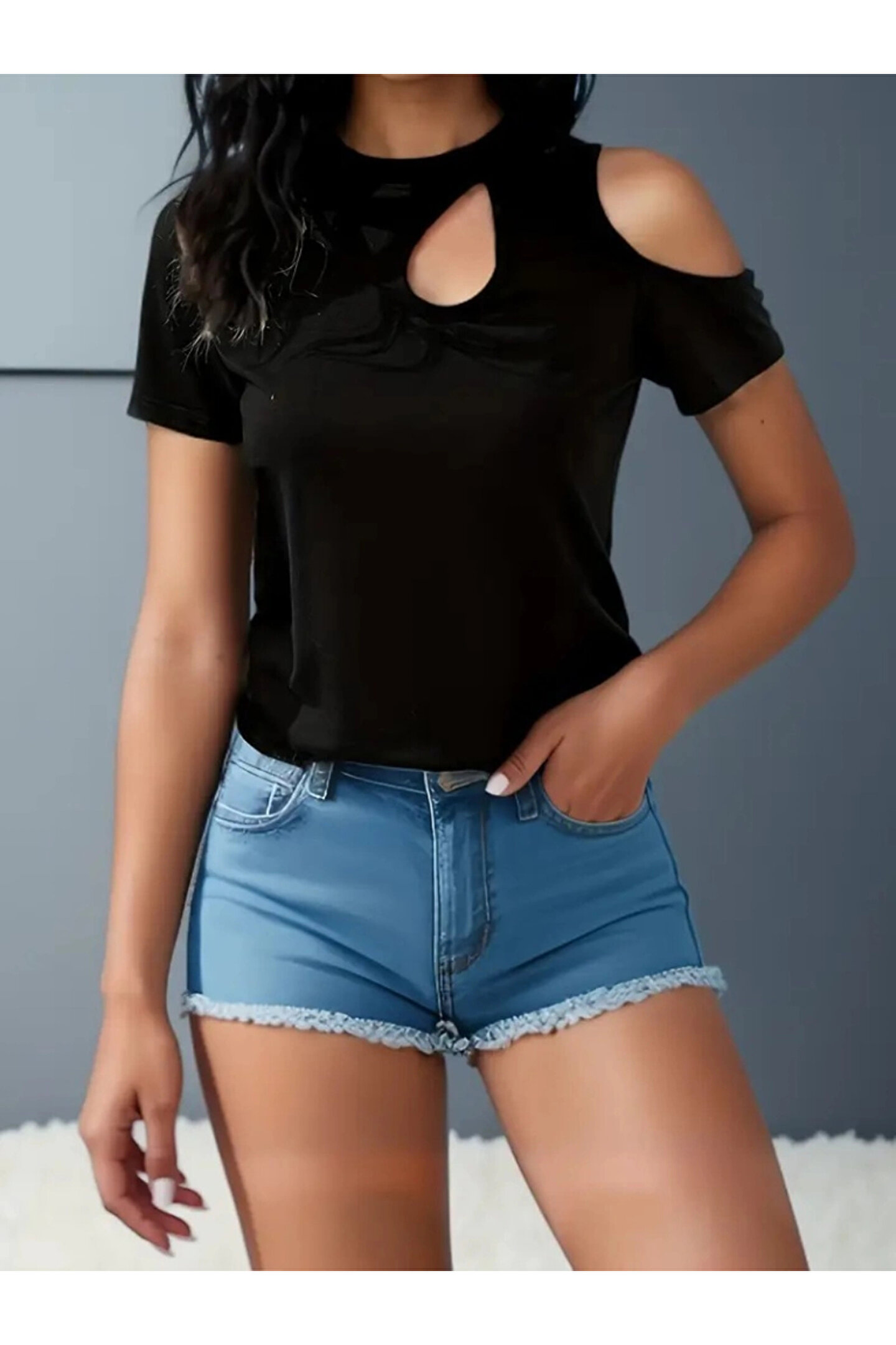 Kadın Kısa Kollu Tek Omuzu Açık Damla Detaylı Viskon Bluz