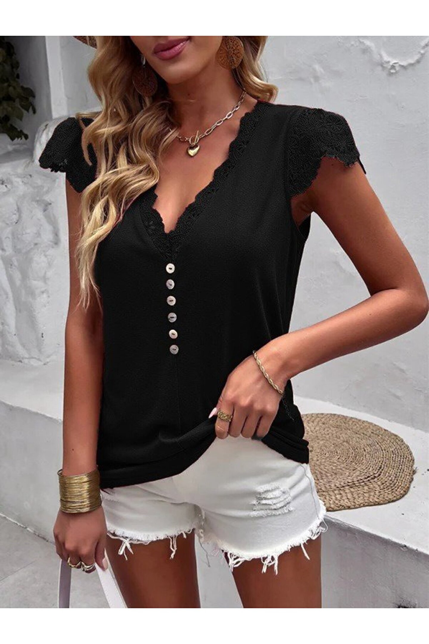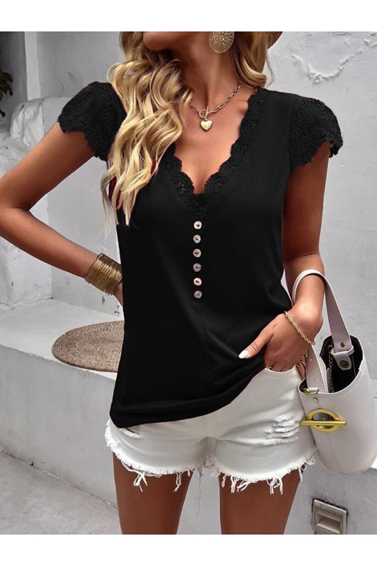 MODA EQURİ Kadın Kısa Kollu V Yakalı önü Düğmeli Viskon Bluz