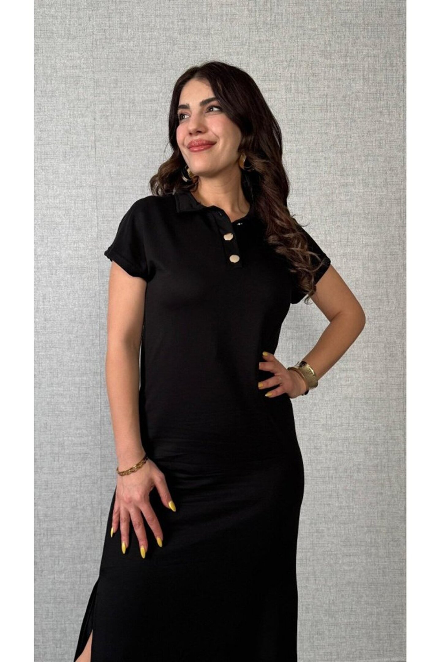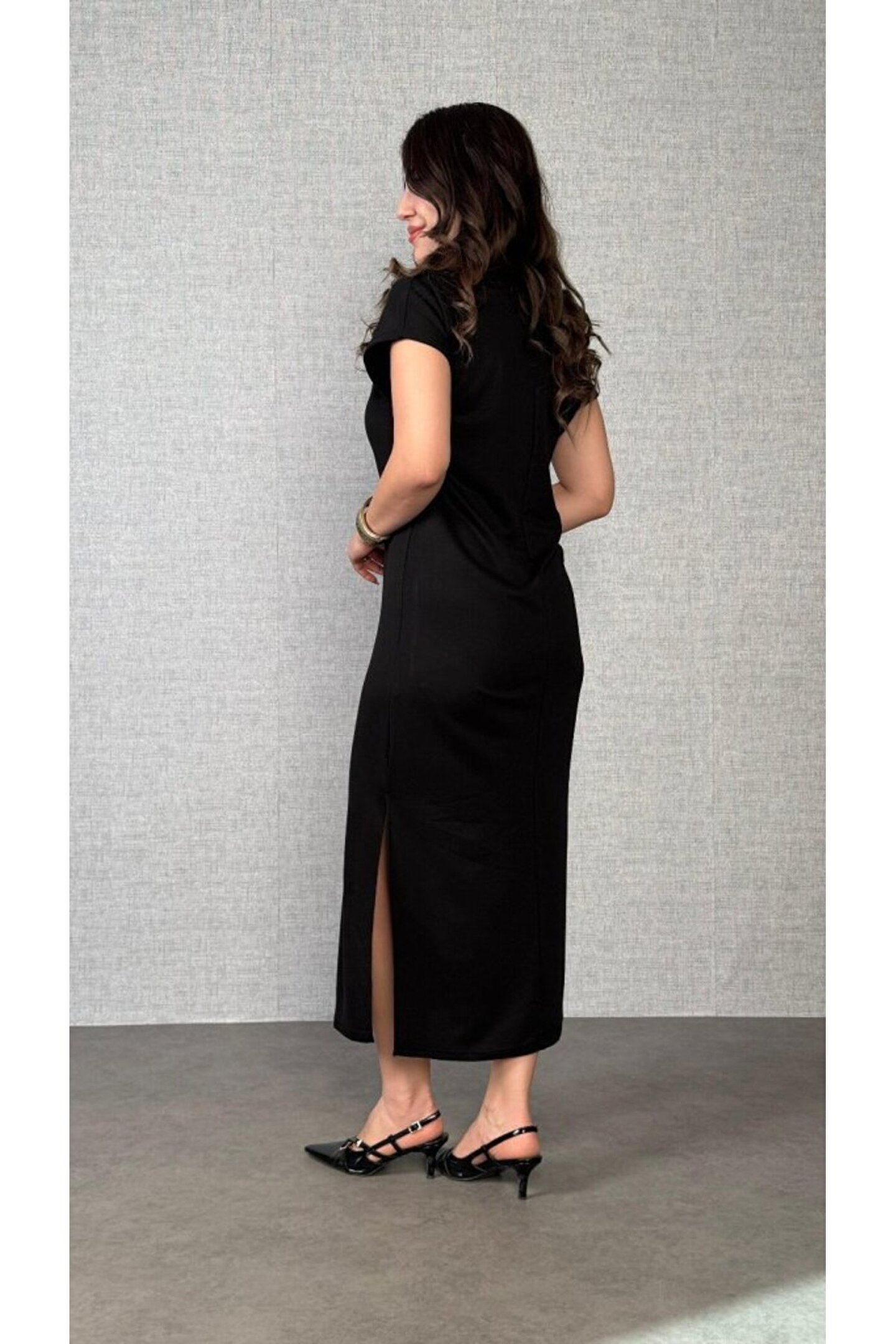 Kadın Kısa Kollu Yakalı Yandan Yırtmaçlı Viskon Iki Iplik Elbise