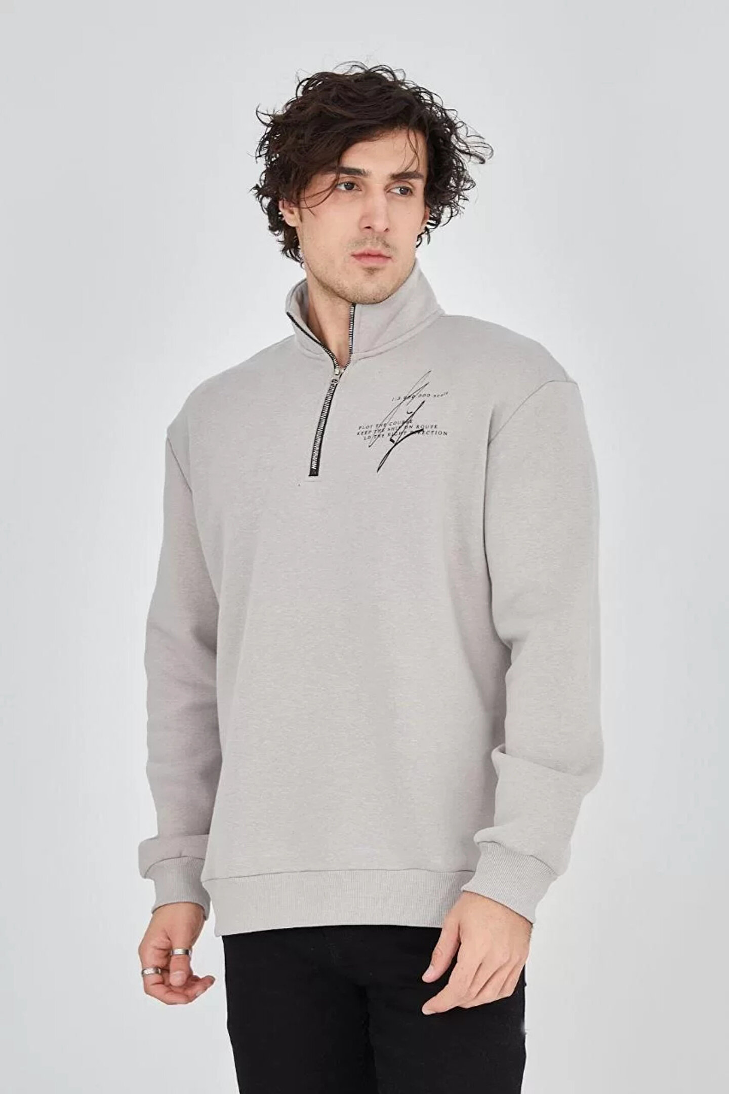 MODA Erkek Yarım Fermuarlı Baskılı Sweat - Boyalı Gri