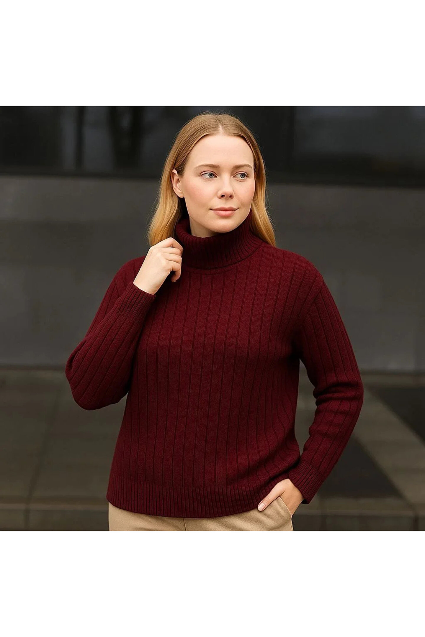 MODA Kadın Balıkcı Yaka Bağazlı Triko Kazak Pamuklu Kalın Fitilli Dokuma - Bordo