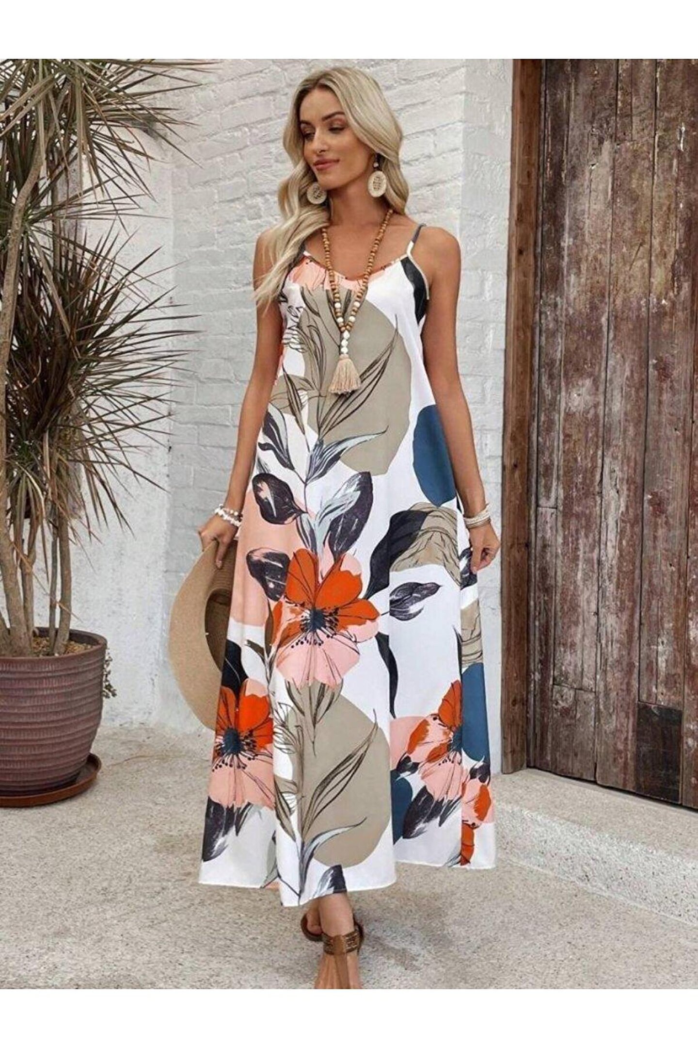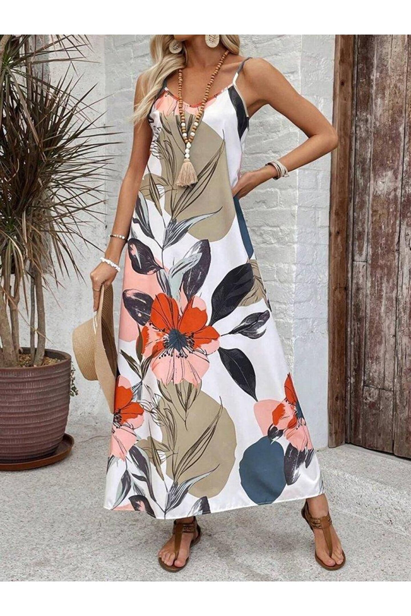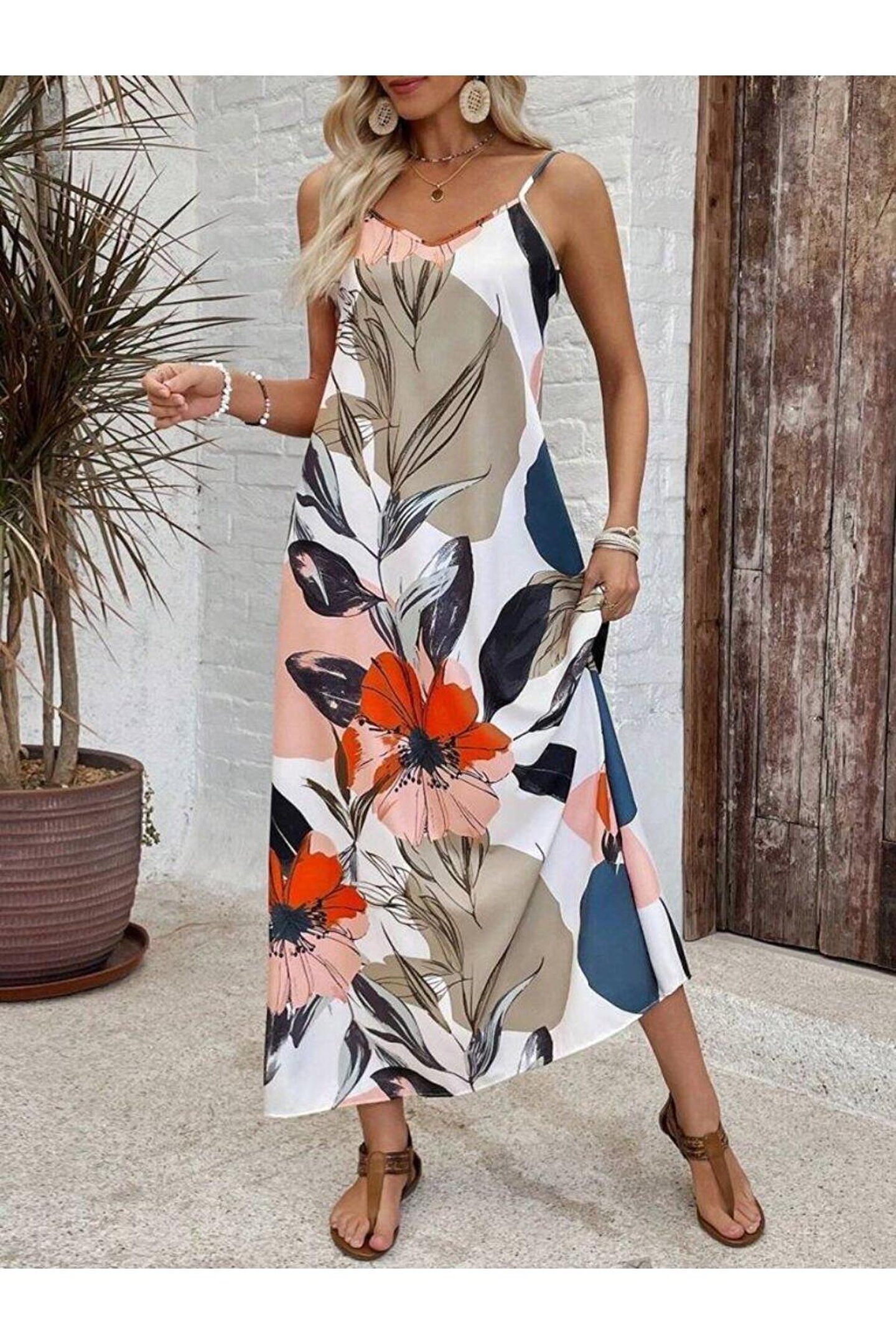 MODA Kadın Ip Askılı Geniş V Yakalı Desenli Süprem Elbise