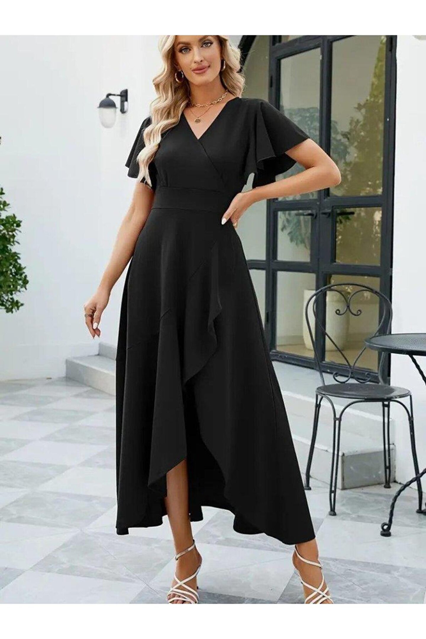 Kadın Kısa Kollu Kruvaze Yakalı önden Volanlı çapraz Kesim Detaylı Maksi Boy Ithal Krep Elbise
