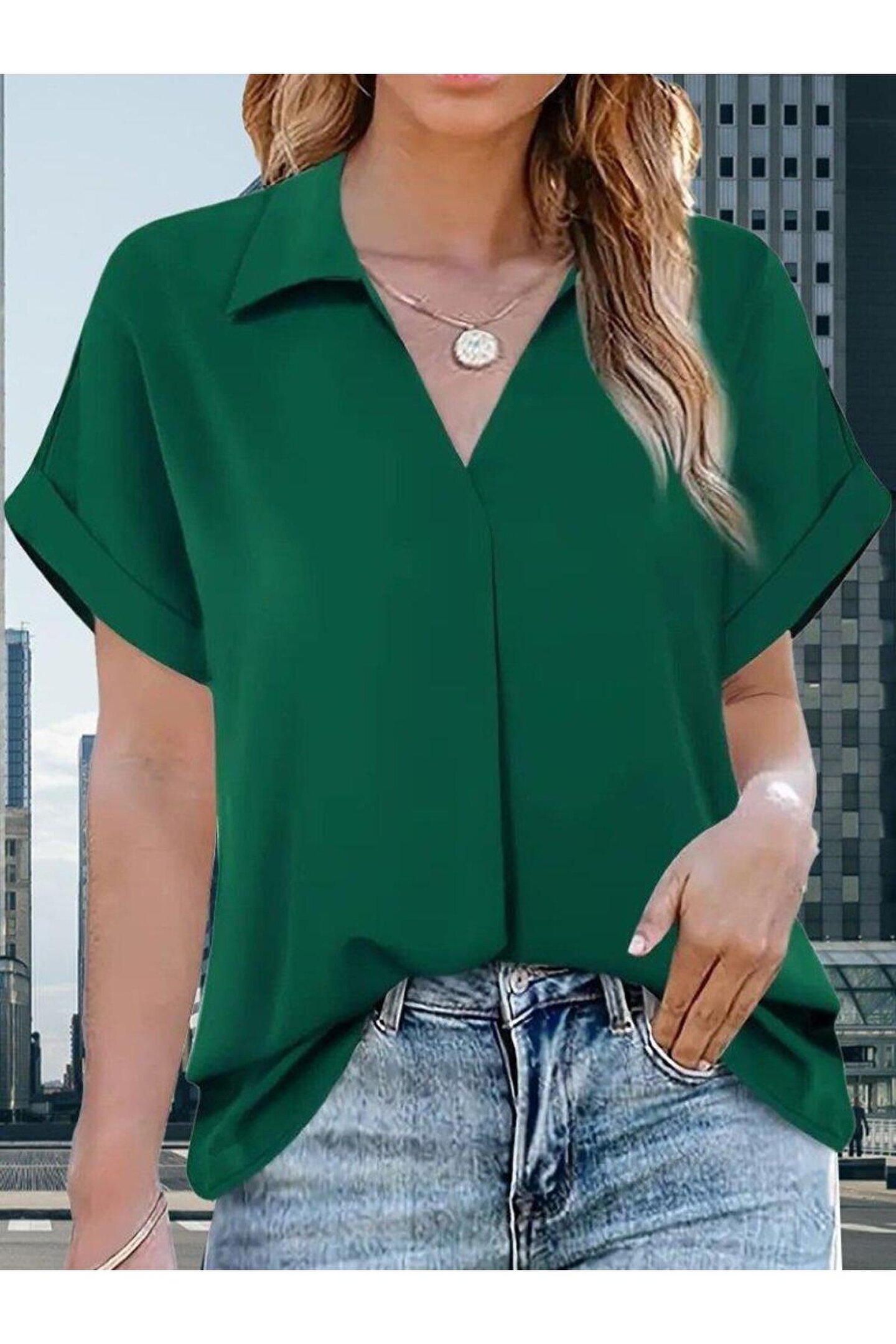 Kadın Kısa Kollu Yakalı Uzun Sandy Bluz