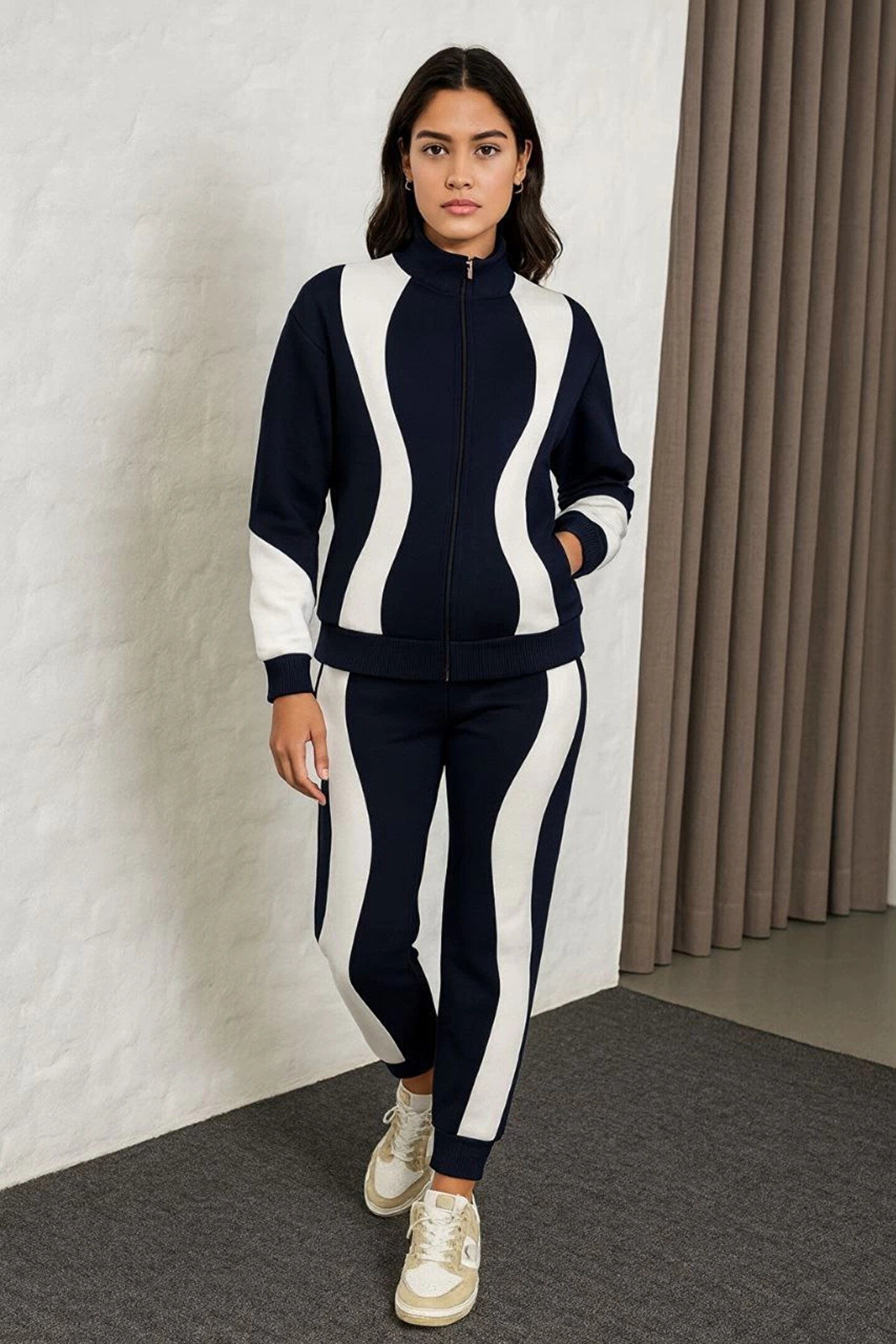 MODA Kadın Premium Parçalı Eşofman Takım - Dik Yaka Fermuarlı Sweatshirt - Siyah