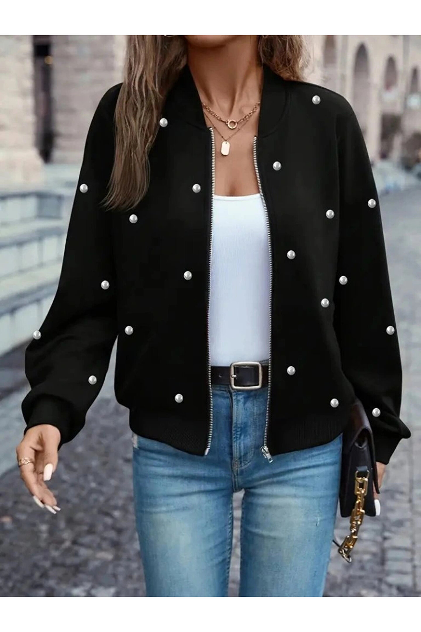 MODA Kadın Uzun Kollu önden Fermuarlı Incili Kısa Modal Ceket