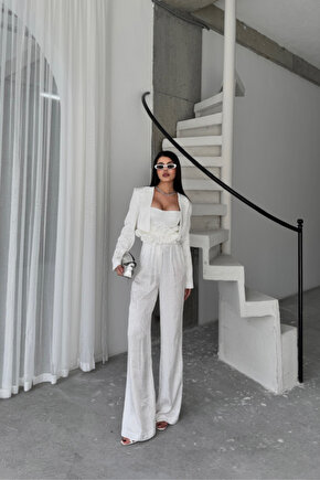 MODA MODAVERA JAKARLI BLUZU TASARIM DETAYLI CEKET-PANTOLON-BLUZ 3 LÜ TAKIM - Beyaz