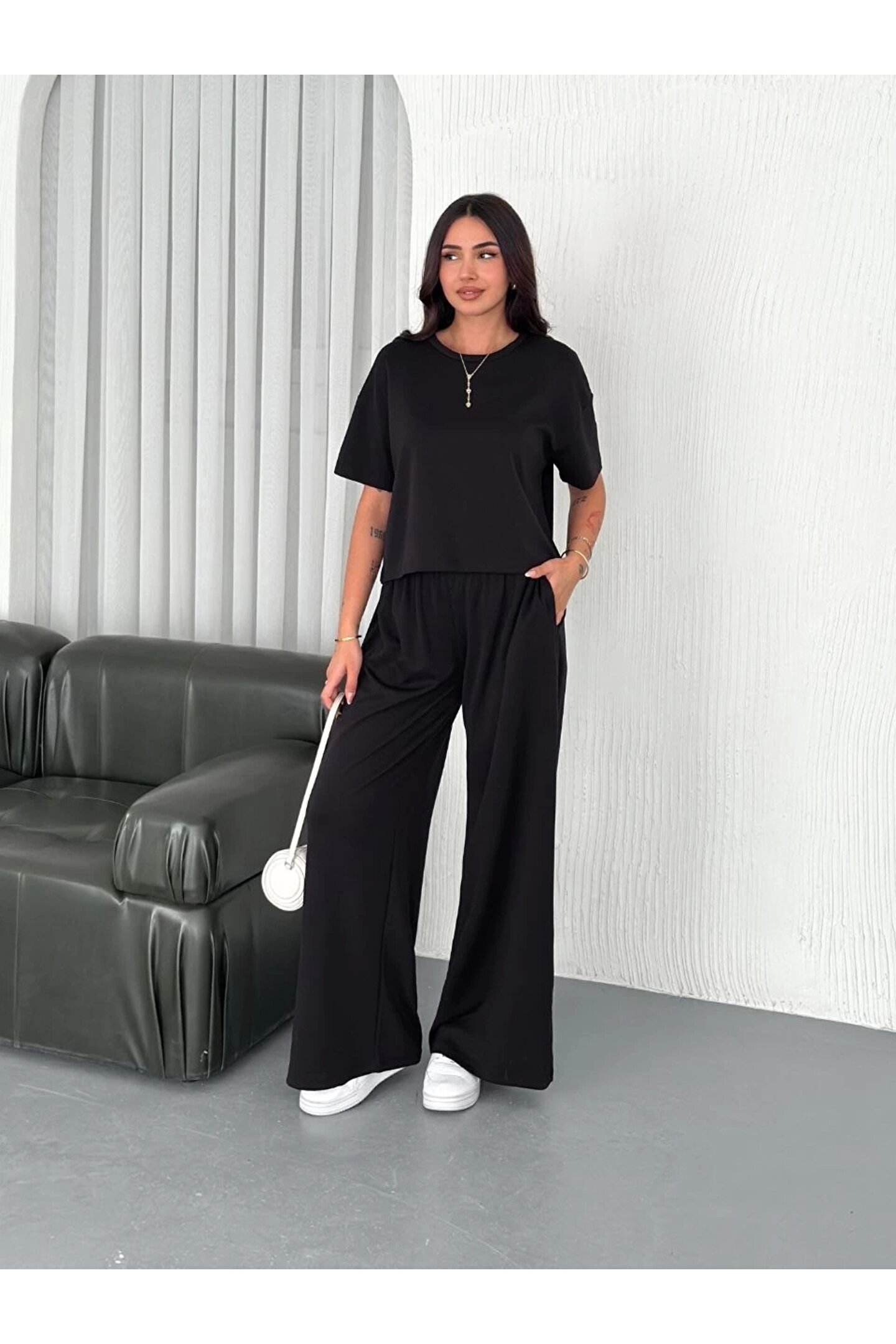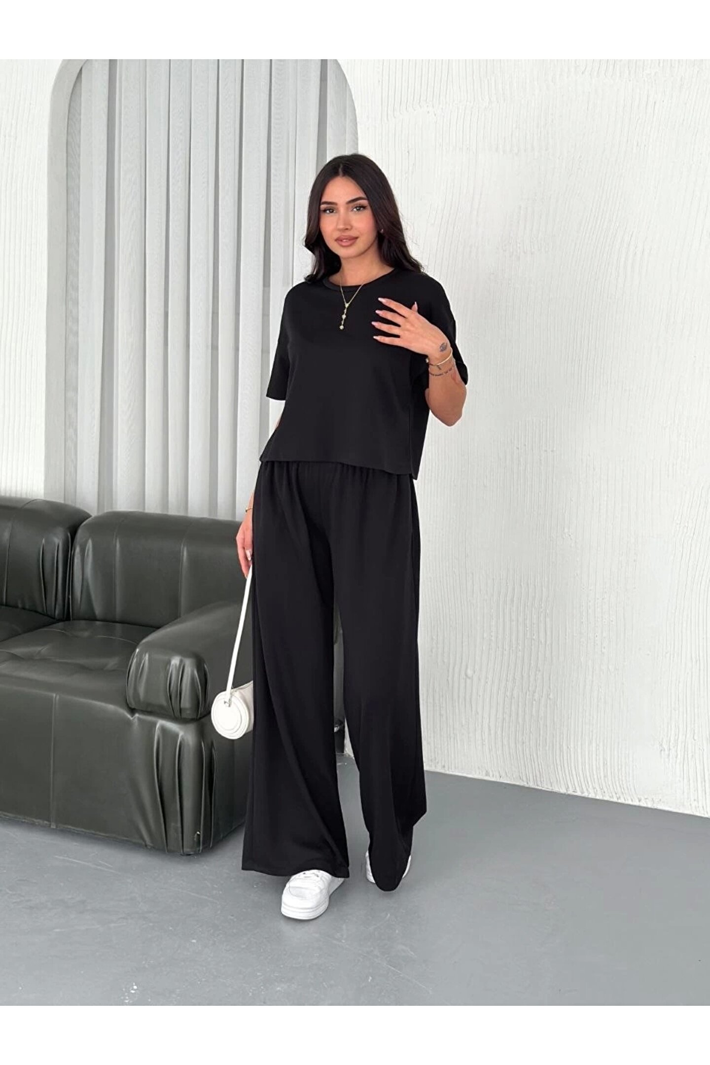 MODA Osy Modal Yumuşak Dokulu Kumaş Bisiklet Yaka T-shirt Bol paça Pantalon ikili Takım -Siyah