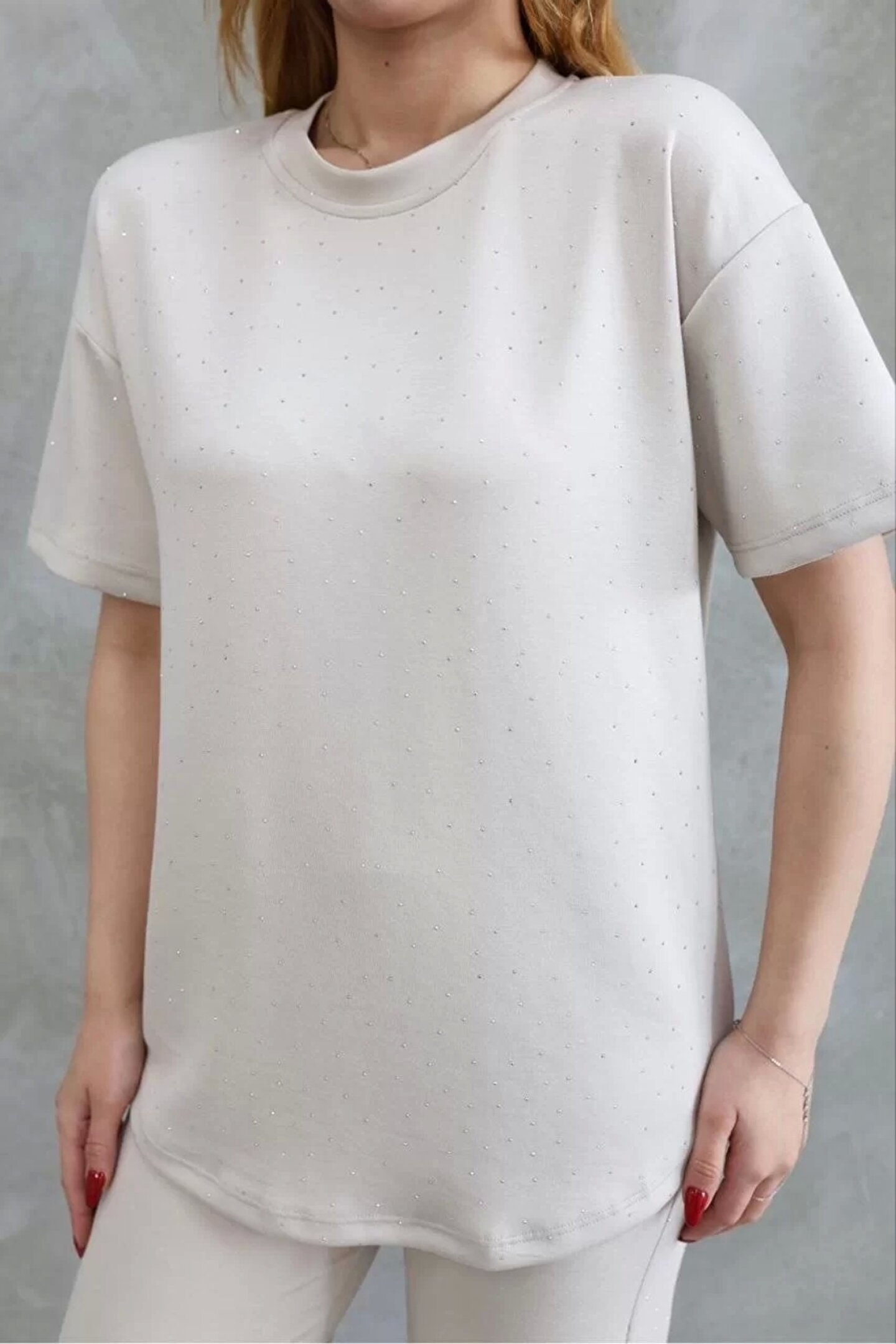 MODA Osy Modal Yumuşak dokulu Kumaş Bisiklet Yaka Taş detaylı Kısa Kollu Takım - Kırık Beyaz