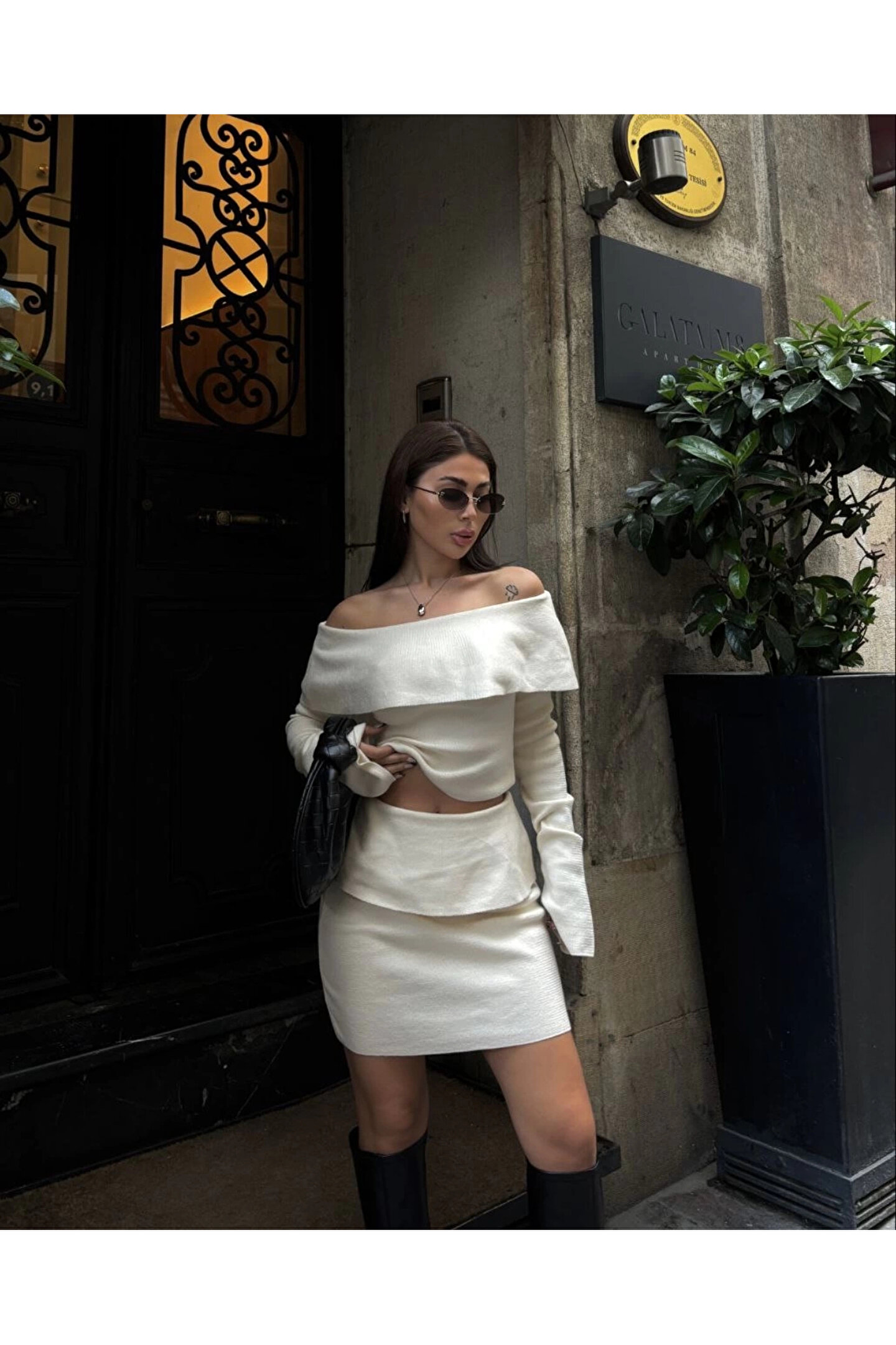 MODA Straplez , Madonna , Carmen Yaka Croplu Mini Etekli ikili Takım Triko - Beyaz