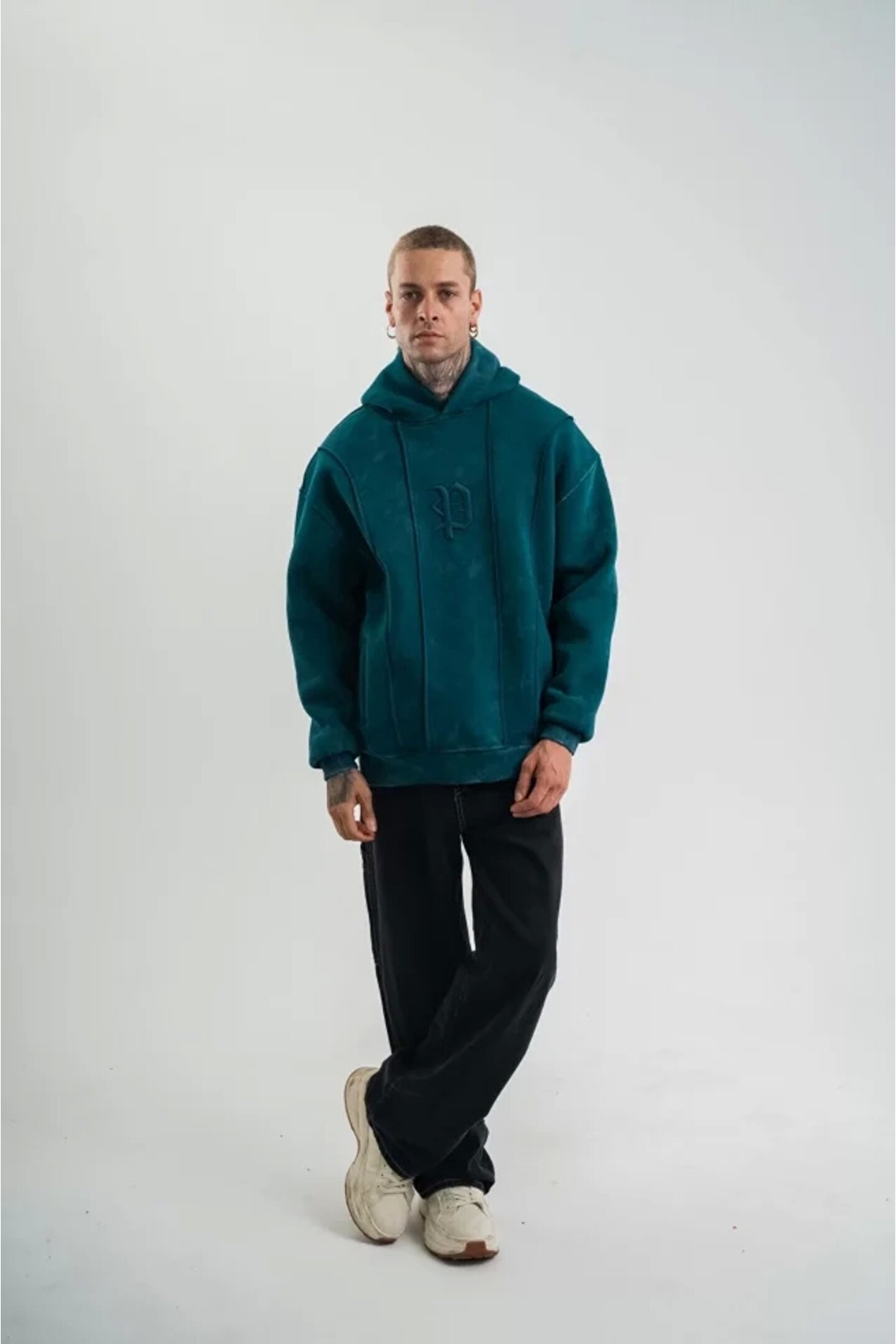 MODA Unisex Uzun Kol Kapşonlu Yıkamalı Nakışlı SweatShirt - Koyu Deniz Yeşili