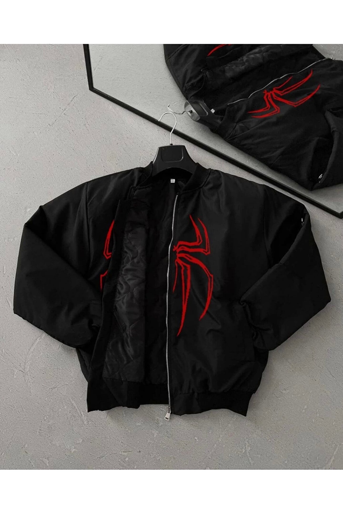 Unisex Uzun Kol Örümcek Baskılı Bomber Ceket - Siyah