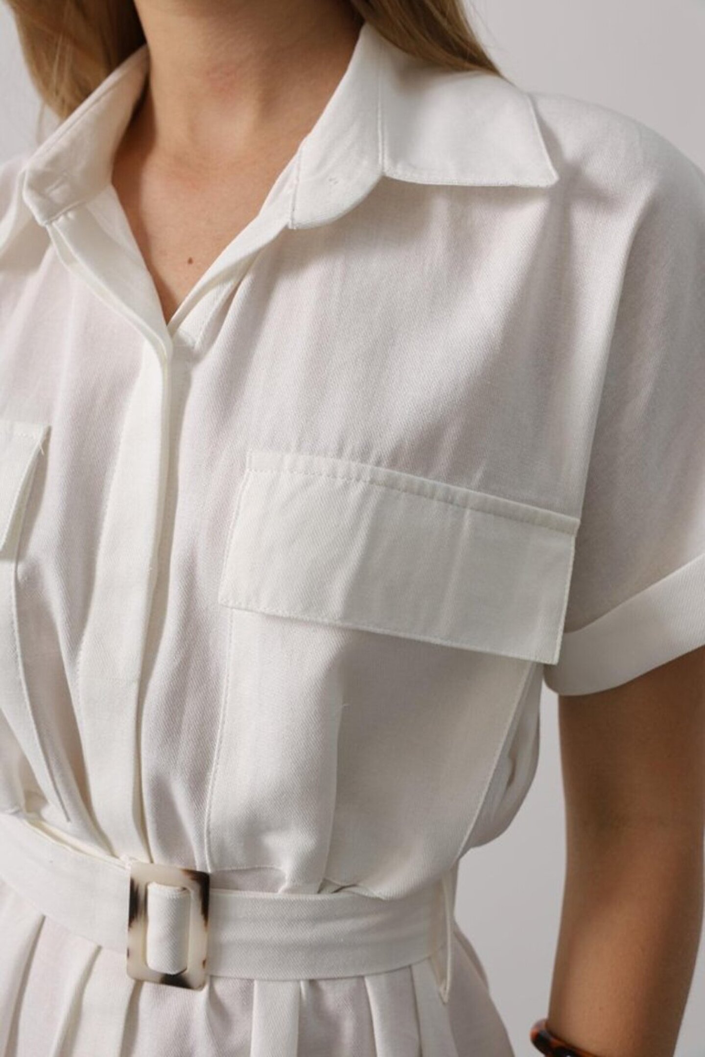 modalisse EQURİ Kuşaklı Cep Detaylı Yarım Kol Elbise - Beyaz