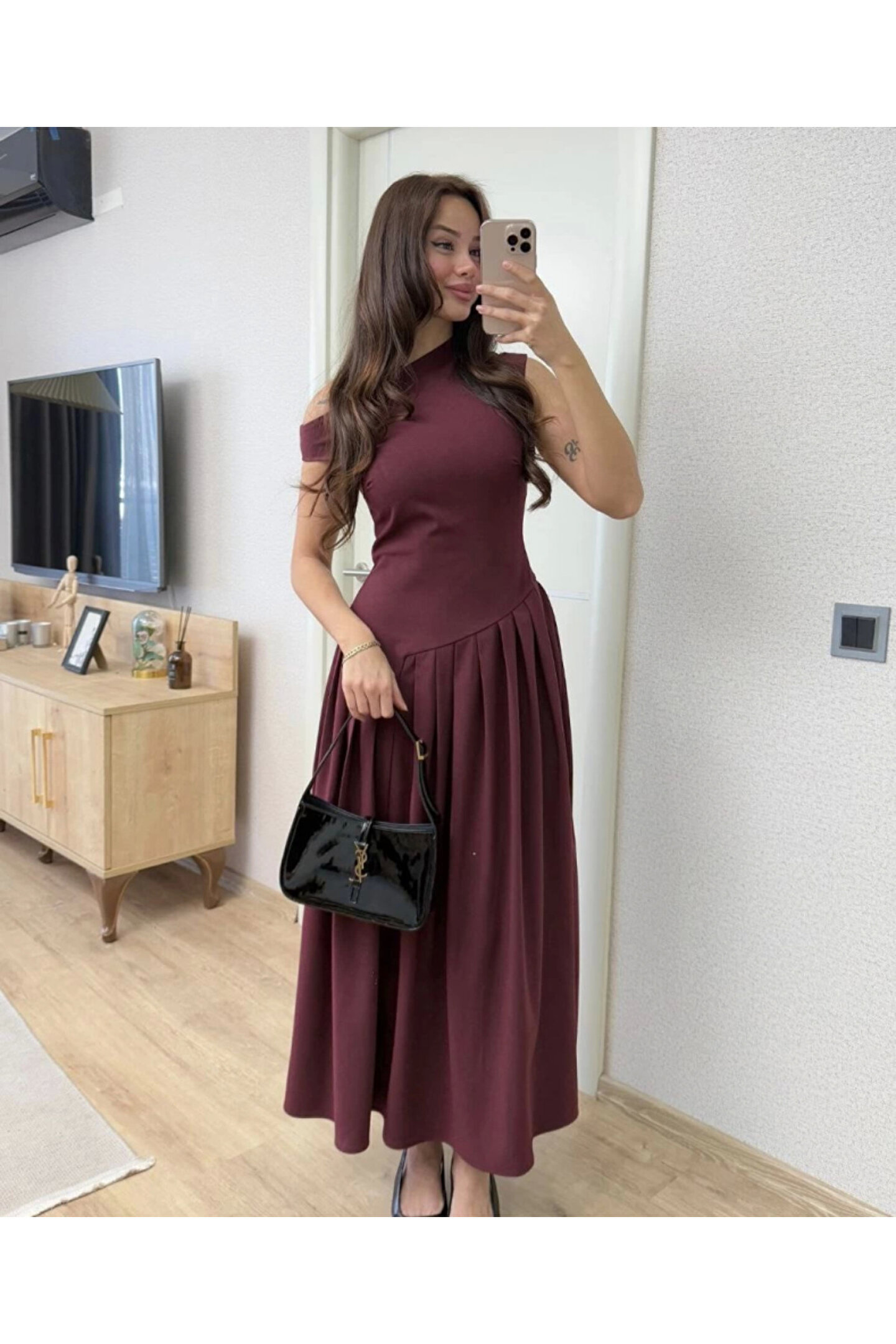 Modayakamoz Asimetrik Düşük Yaka Kolsuz Uzun Elbise - Bordo