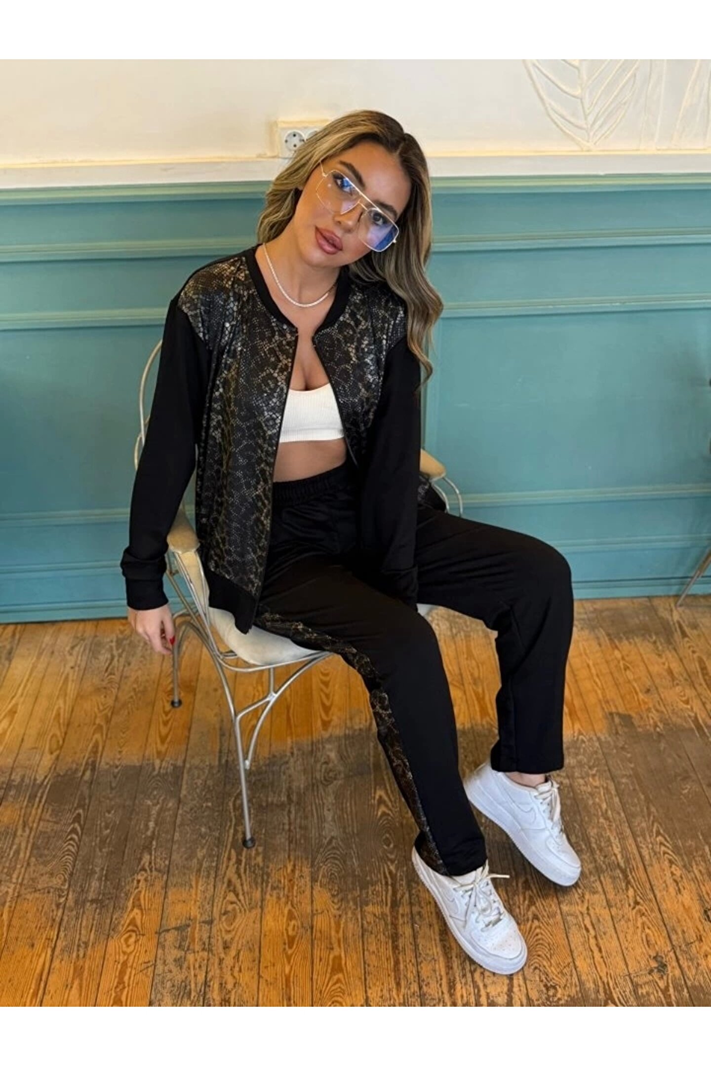 Modayakamoz Kadın İki İplik Kumaş Yılan Desenli Fermuarlı İkili Takım