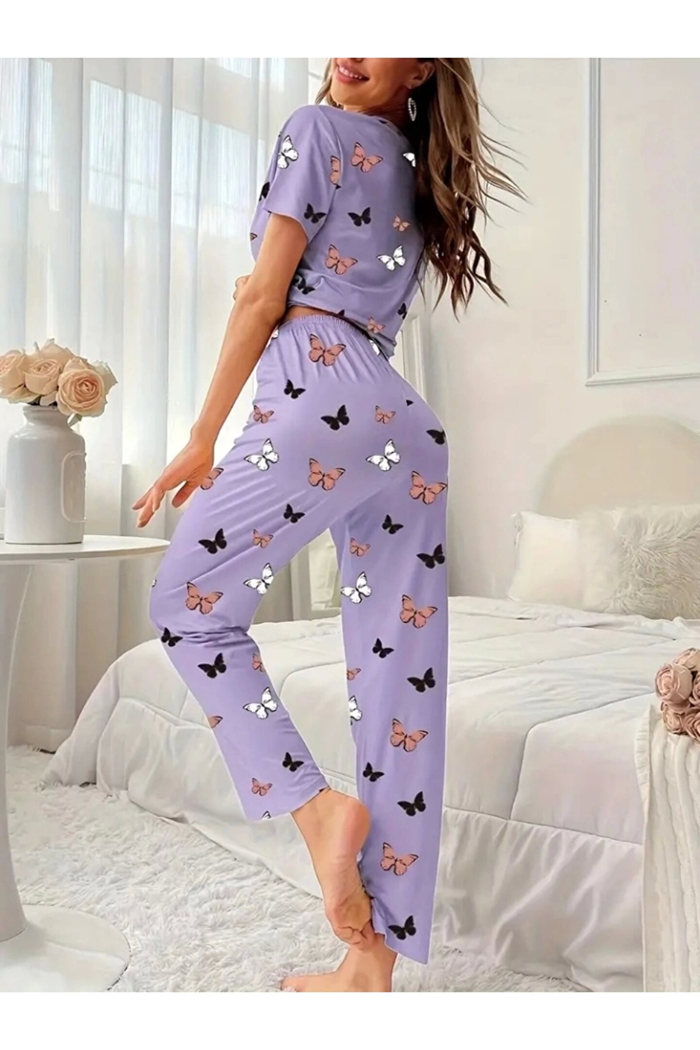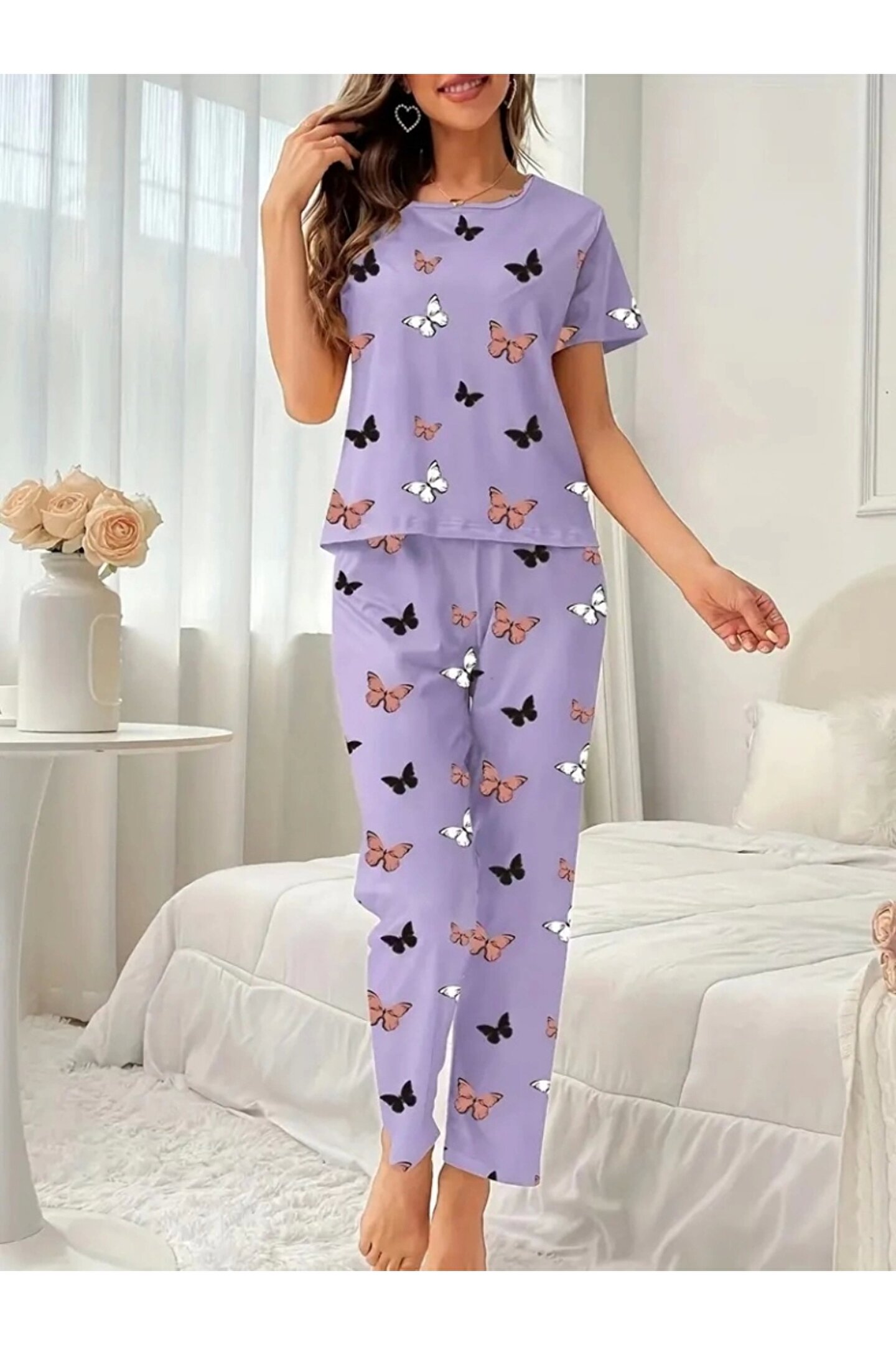 Modayakamoz Kadın Kısa Kollu Bisiklet Yaka Kelebek Baskılı Süprem Ikili Takım