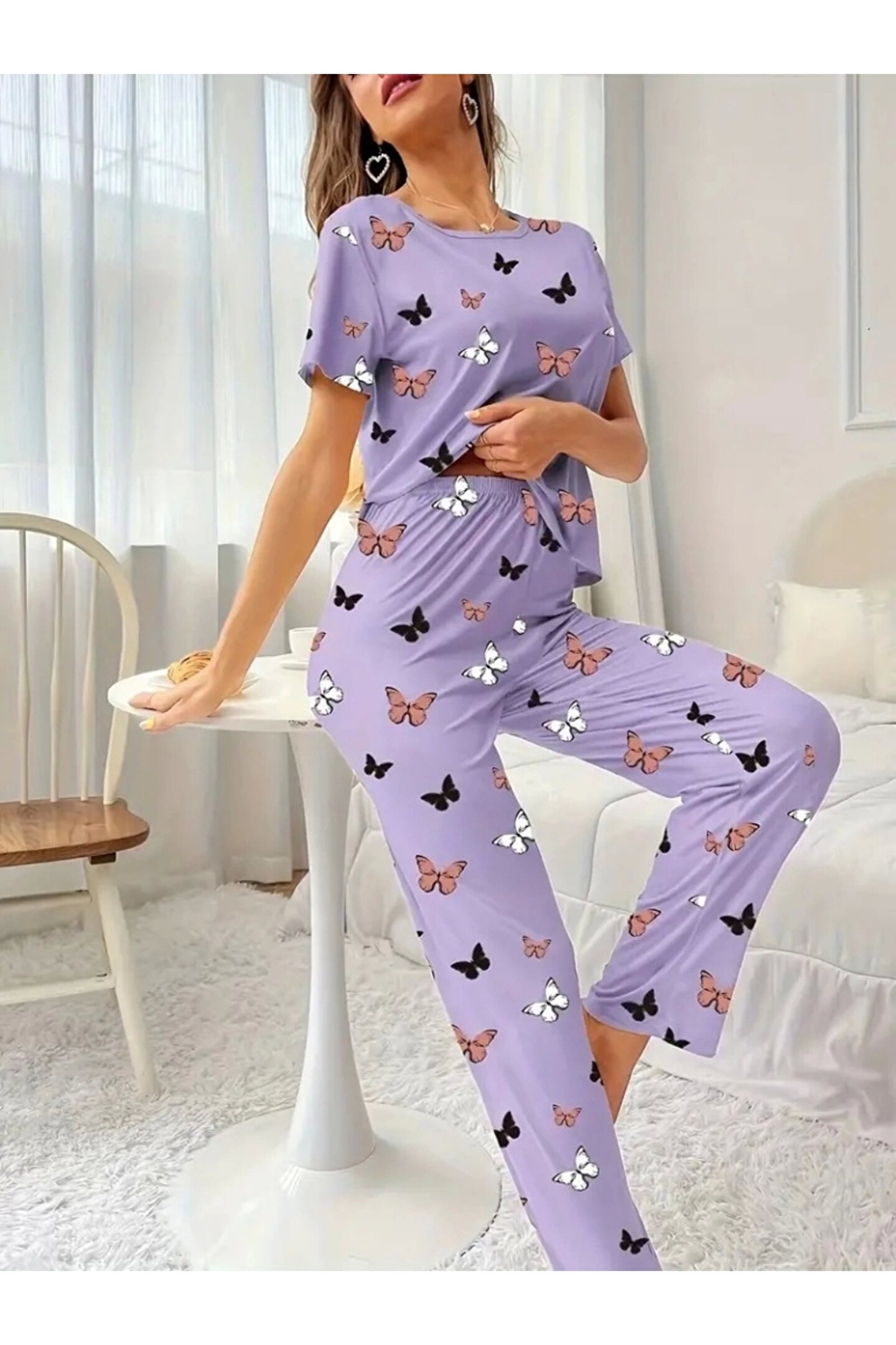 Kadın Kısa Kollu Bisiklet Yaka Kelebek Baskılı Süprem Ikili Takım