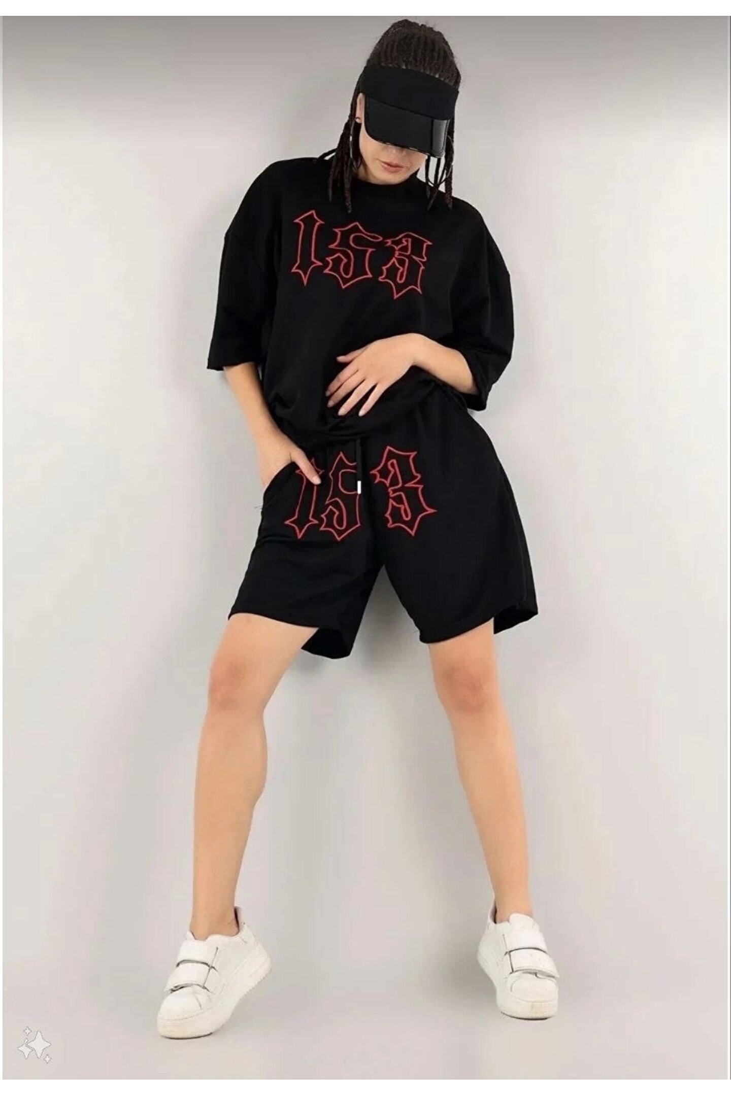Modayakamoz Kadın Unisex Nakış İşlemeli Şort Takım - Siyah