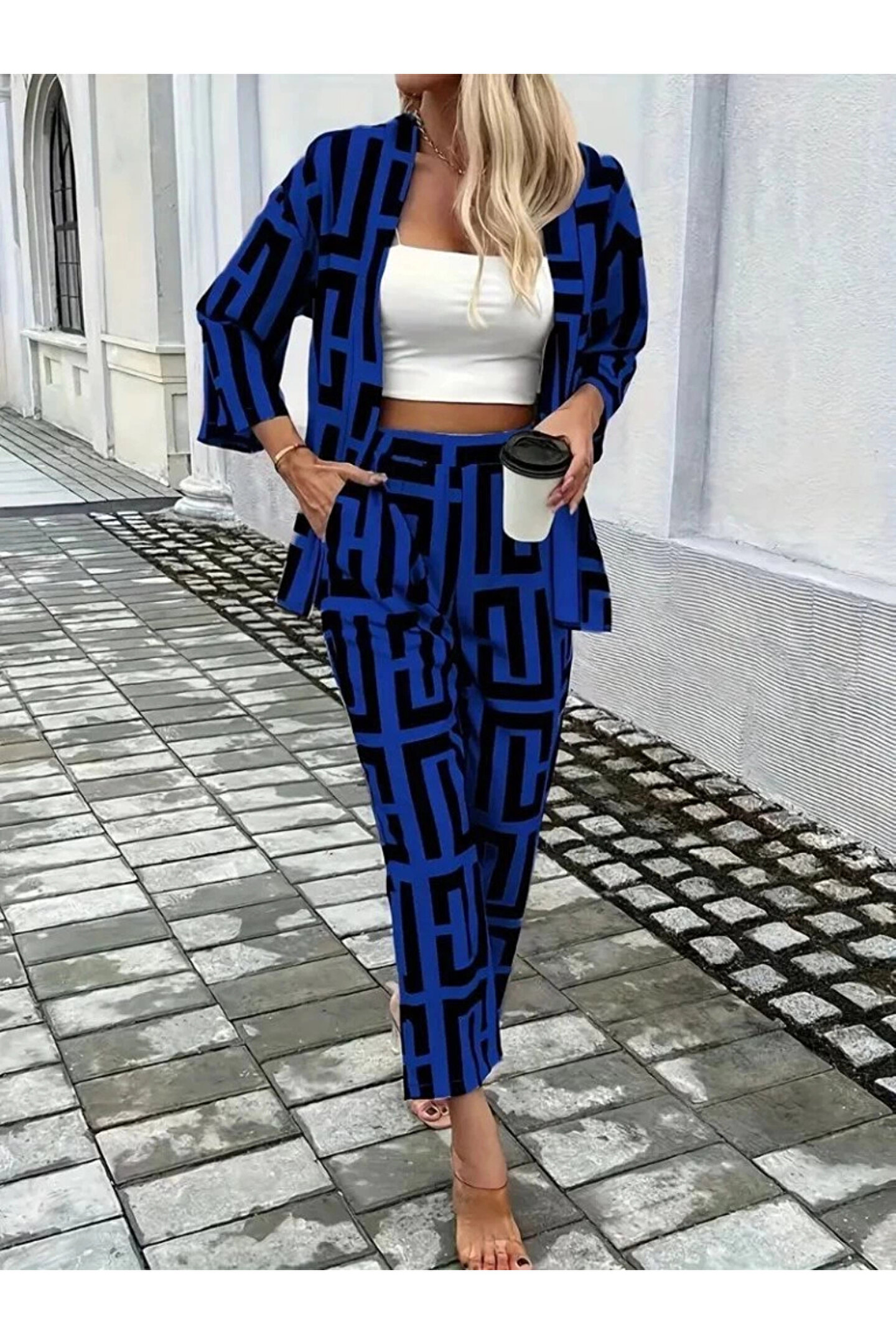 Modayakamoz Kadın Uzun Kollu önü Açık Desenli Iki Iplik Ceket Ve Pantolon Ikili Takım