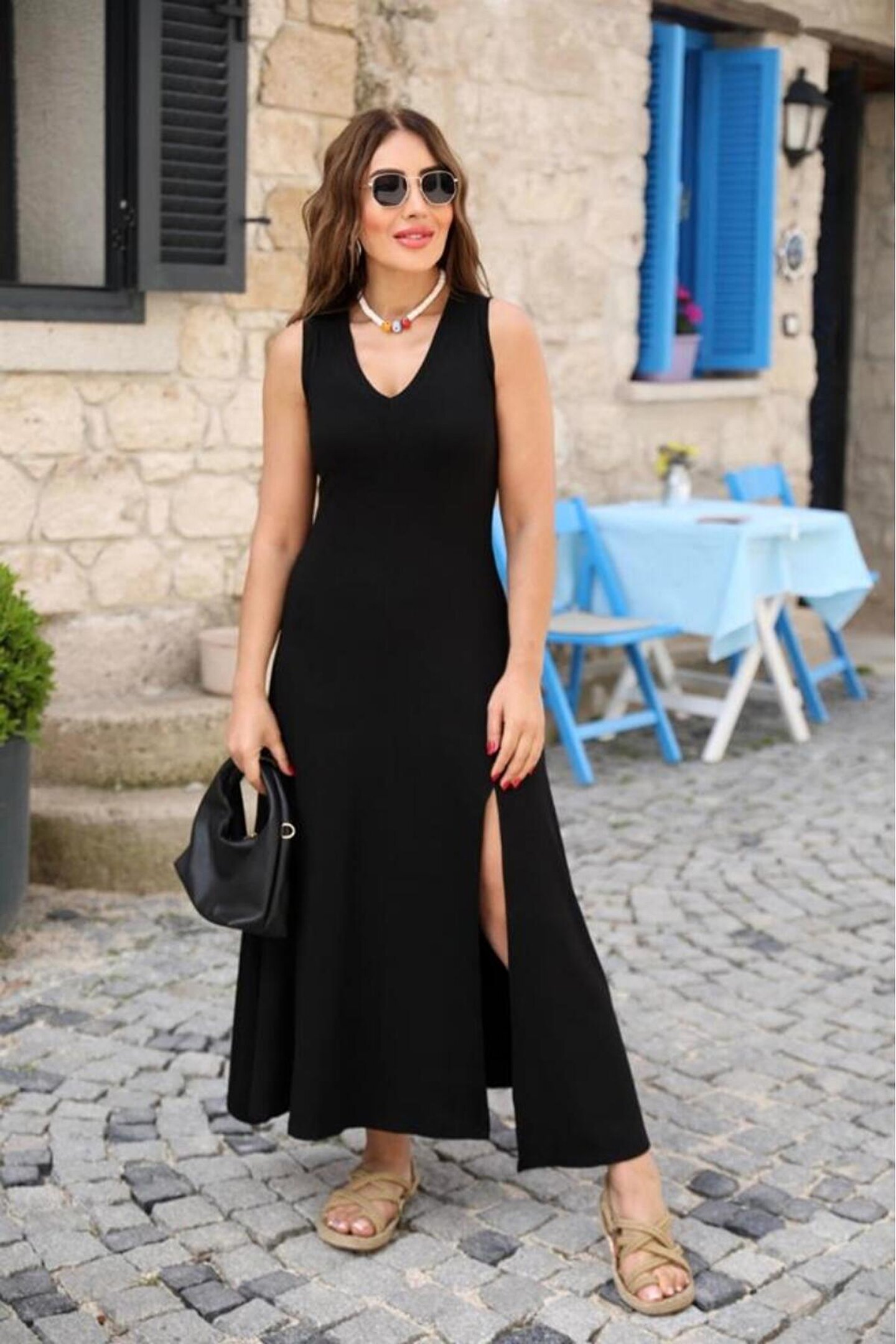 Kadın Askılı V Yakalı Yırtmaçlı Viskon Elbise